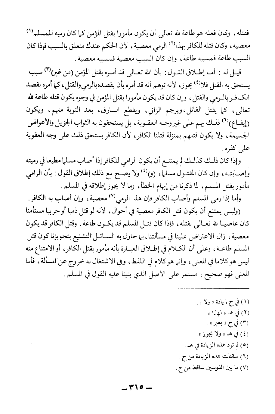 فَقَتَلَهُ، وَكَانَ فِعْلُهُ هُوَ طَاعَةٌ لِلَّهِ تَعَالَى أَنْ يَكُونَ مَأْمُورًا بِقَتْلِ الْمُؤْمِنِ كَمَا كَانَ رَمْيُهُ لِلْمُسْلِمِ مَعْصِيَةً، وَكَانَ قَتْلُهُ لِلْكَافِرِ بِهَذَا الرَّمْيِ مَعْصِيَةً، لِأَنَّ الْحُكْمَ عِنْدَك مُتَعَلِّقٌ بِالسَّبَبِ فَإِذَا كَانَ السَّبَبُ طَاعَةً فَمُسَبَّبُهُ طَاعَةٌ، وَإِنْ كَانَ السَّبَبُ مَعْصِيَةً فَمُسَبَّبُهُ مَعْصِيَةٌ. قِيلَ لَهُ: أَمَّا إطْلَاقُ الْقَوْلِ: بِأَنَّ اللَّهَ تَعَالَى قَدْ أَمَرَهُ بِقَتْلِ الْمُؤْمِنِ (مِنْ غَيْرِ) سَبَبٍ يَسْتَحِقُّ بِهِ الْقَتْلَ فَلَا يَجُوزُ، لِأَنَّهُ تَوَهَّمَ أَنَّهُ قَدْ أَمَرَهُ بِأَنْ يَقْصِدَهُ بِالرَّمْيِ وَالْقَتْلِ، كَمَا أَمَرَهُ بِقَصْدِ الْكَافِرِ بِالرَّمْيِ وَالْقَتْلِ، وَإِنْ كَانَ قَدْ يَكُونُ مَأْمُورًا بِقَتْلِ الْمُؤْمِنِ فِي وُجُوهٍ يَكُونُ قَتْلُهُ طَاعَةً لِلَّهِ تَعَالَى، كَمَا يُقْتَلُ الْقَاتِلُ، وَيُرْجَمُ الزَّانِي، وَيُقْطَعُ السَّارِقُ، بَعْدَ التَّوْبَةِ مِنْهُمْ، وَيَكُونُ (إيقَاعُ) ذَلِكَ بِهِمْ عَلَى غَيْرِ وَجْهِ الْعُقُوبَةِ، بَلْ يَسْتَحِقُّونَ بِهِ الثَّوَابَ الْجَزِيلَ وَالْأَعْوَاضَ الْجَسِيمَةَ، وَلَا يَكُونُ قَتْلُهُمْ بِمَنْزِلَةِ قَتْلِنَا الْكَافِرَ، لِأَنَّ الْكَافِرَ يَسْتَحِقُّ ذَلِكَ عَلَى وَجْهِ الْعُقُوبَةِ عَلَى كُفْرِهِ.