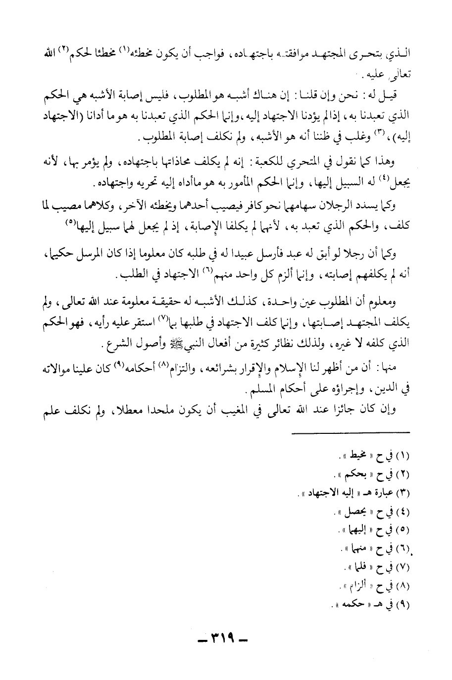 الَّذِي يَتَحَرَّى الْمُجْتَهِدُ مُوَافَقَتَهُ بِاجْتِهَادِهِ، فَوَاجِبٌ أَنْ يَكُونَ مُخْطِئُهُ مُخْطِئًا لِحُكْمِ اللَّهِ تَعَالَى عَلَيْهِ. قِيلَ لَهُ: نَحْنُ وَإِنْ قُلْنَا: إنَّ هُنَاكَ أَشْبَهَ هُوَ الْمَطْلُوبُ، فَلَيْسَ إصَابَةُ الْأَشْبَهِ هِيَ الْحُكْمُ الَّذِي تَعَبَّدْنَا بِهِ، إذَا لَمْ يُؤَدِّنَا الِاجْتِهَادُ إلَيْهِ، وَإِنَّمَا الْحُكْمُ الَّذِي تَعَبَّدْنَا بِهِ هُوَ مَا أَدَّانَا (الِاجْتِهَادُ إلَيْهِ) ، وَغَلَبَ فِي ظَنِّنَا أَنَّهُ هُوَ الْأَشْبَهُ، وَلَمْ نُكَلَّفْ إصَابَةَ الْمَطْلُوبِ. وَهَذَا كَمَا نَقُولُ فِي الْمُتَحَرِّي لِلْكَعْبَةِ: إنَّهُ لَمْ يُكَلَّفْ مُحَاذَاتَهَا بِاجْتِهَادِهِ، وَلَمْ يُؤْمَرْ بِهَا، لِأَنَّهُ يُجْعَلُ لَهُ السَّبِيلُ إلَيْهَا، وَإِنَّمَا الْحُكْمُ الْمَأْمُورُ بِهِ هُوَ مَا أَدَّاهُ إلَيْهِ تَحَرِّيه وَاجْتِهَادُهُ. وَكَمَا يُسَدِّدُ الرَّجُلَانِ سِهَامَهُمَا نَحْوَ كَافِرٍ فَيُصِيبُ أَحَدُهُمَا وَيُخْطِئُهُ الْآخَرُ، وَكِلَاهُمَا مُصِيبٌ لِمَا كُلِّفَ، وَالْحُكْمُ الَّذِي تَعَبَّدَ بِهِ، لِأَنَّهُمَا لَمْ يُكَلَّفَا الْإِصَابَةَ، إذْ لَمْ يُجْعَلْ لَهُمَا سَبِيلٌ إلَيْهَا وَكَمَا أَنَّ رَجُلًا لَوْ أَبَقَ لَهُ عَبْدٌ فَأَرْسَلَ عَبِيدًا لَهُ فِي طَلَبِهِ كَانَ مَعْلُومًا إذَا كَانَ الْمُرْسِلُ حَكِيمًا، أَنَّهُ لَمْ يُكَلِّفْهُمْ إصَابَتَهُ، وَإِنَّمَا أَلْزَمَ كُلَّ وَاحِدٍ مِنْهُمْ الِاجْتِهَادَ فِي الطَّلَبِ. وَمَعْلُومٌ أَنَّ الْمَطْلُوبَ عَيْنٌ وَاحِدَةٌ، كَذَلِكَ الْأَشْبَهُ لَهُ حَقِيقَةٌ مَعْلُومَةٌ عِنْدَ اللَّهِ تَعَالَى، وَلَمْ يُكَلَّفْ الْمُجْتَهِدُ إصَابَتَهَا، وَإِنَّمَا كُلِّفَ الِاجْتِهَادُ فِي طَلَبِهَا بِمَا اسْتَقَرَّ عَلَيْهِ رَأْيُهُ، فَهُوَ الْحُكْمُ الَّذِي كُلِّفَهُ لَا غَيْرُهُ.