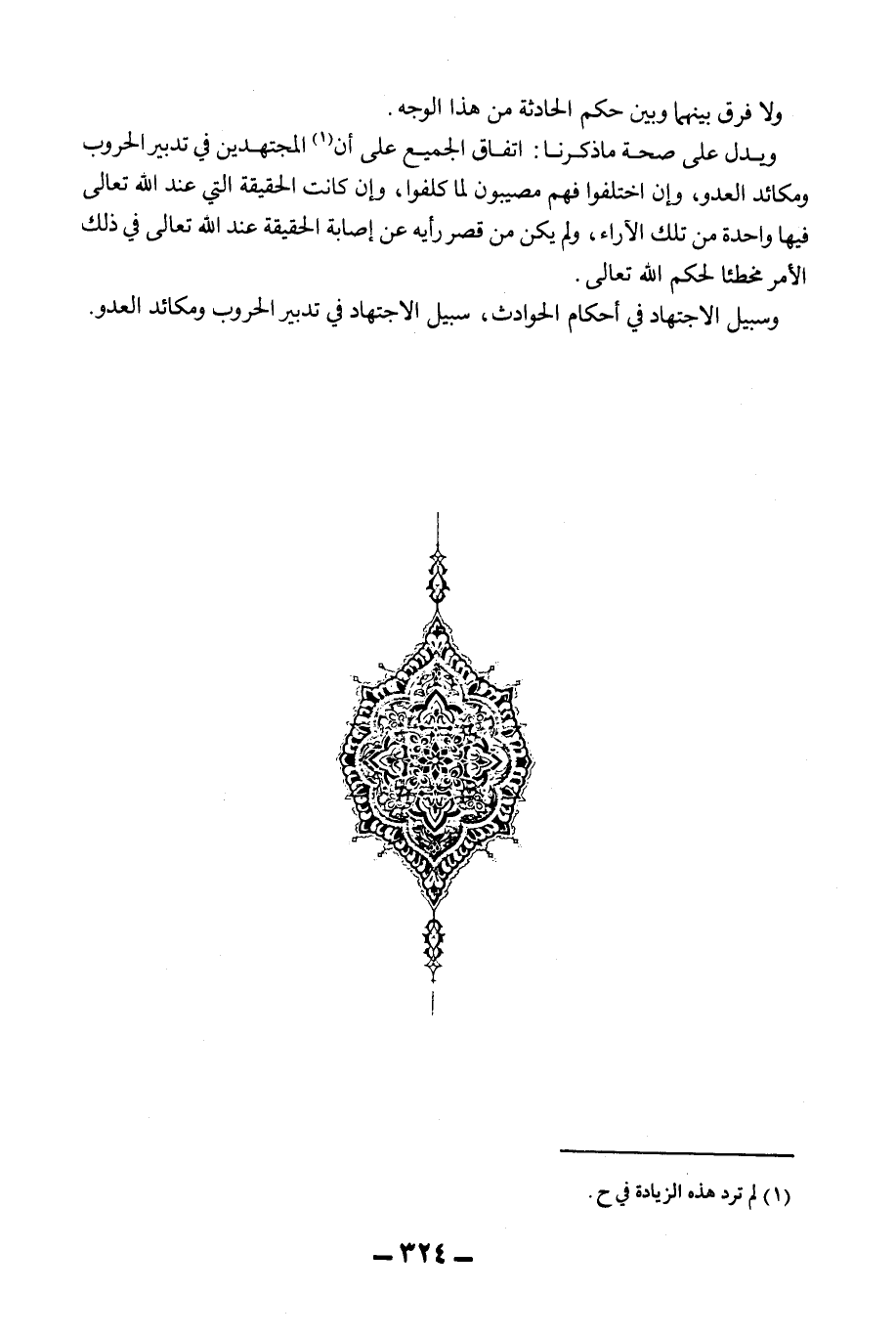 وَلَا فَرْقَ بَيْنَهُمَا وَبَيْنَ حُكْمِ الْحَادِثَةِ مِنْ هَذَا الْوَجْهِ. وَيَدُلُّ عَلَى صِحَّةِ مَا ذَكَرْنَا: اتِّفَاقُ الْجَمِيعِ عَلَى أَنَّ الْمُجْتَهِدِينَ فِي تَدْبِيرِ الْحُرُوبِ وَمَكَائِدِ الْعَدُوِّ، وَإِنْ اخْتَلَفُوا فَهُمْ مُصِيبُونَ لِمَا كُلِّفُوا، وَإِنْ كَانَتْ الْحَقِيقَةُ الَّتِي عِنْدَ اللَّهِ تَعَالَى فِيهَا وَاحِدَةٌ مِنْ تِلْكَ الْآرَاءِ، وَلَمْ يَكُنْ مِنْ قِصَرِ رَأْيِهِ عَنْ إصَابَةِ الْحَقِيقَةِ عِنْدَ اللَّهِ تَعَالَى فِي ذَلِكَ الْأَمْرِ مُخْطِئًا لِحُكْمِ اللَّهِ تَعَالَى. وَسَبِيلُ الِاجْتِهَادِ فِي أَحْكَامِ الْحَوَادِثِ، سَبِيلُ الِاجْتِهَادِ فِي تَدْبِيرِ الْحُرُوبِ وَمَكَائِدِ الْعَدُوِّ.