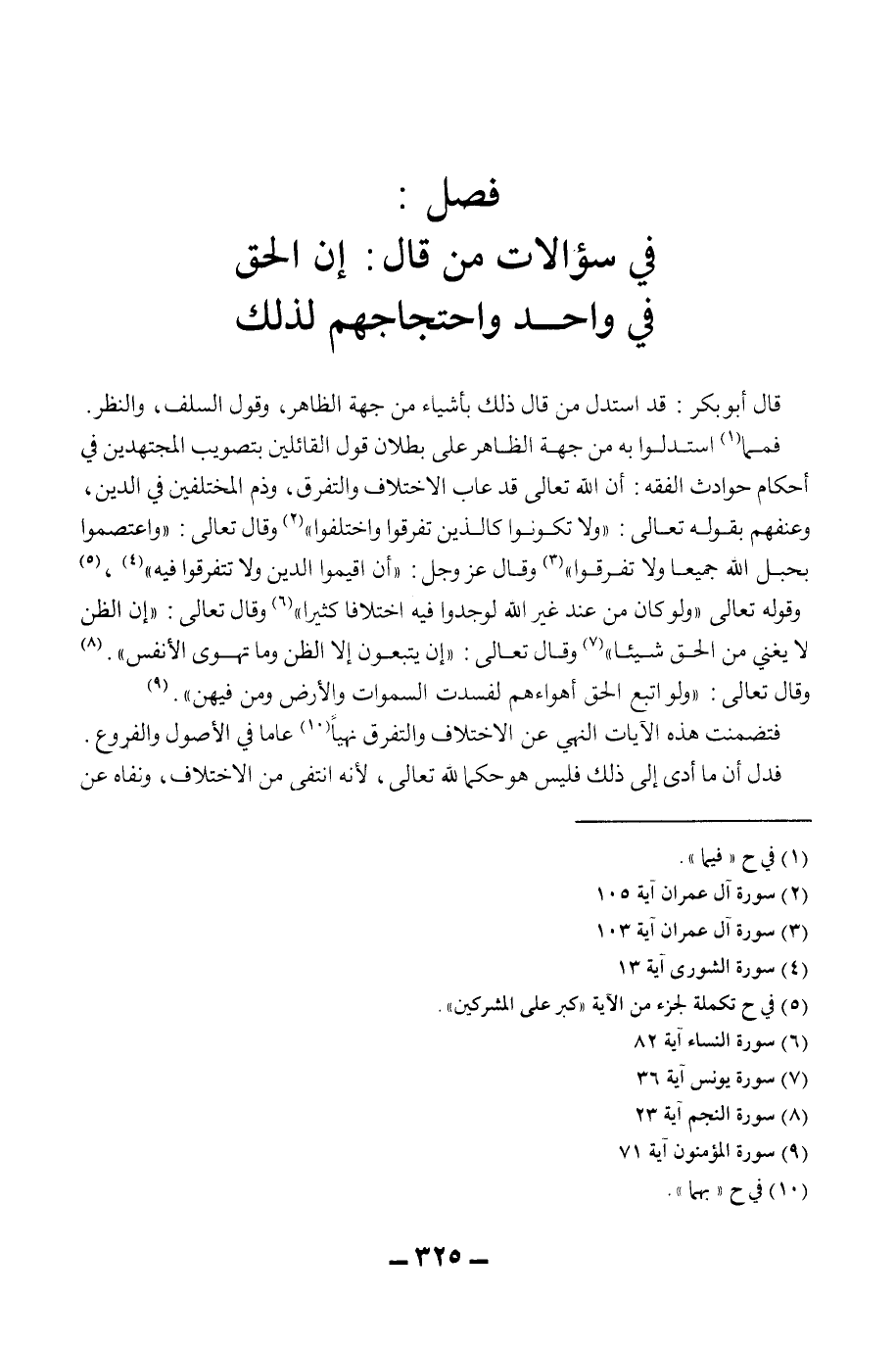 َ قَالَ أَبُو بَكْرٍ: قَدْ اسْتَدَلَّ مَنْ قَالَ ذَلِكَ بِأَشْيَاءَ مِنْ جِهَةِ الظَّاهِرِ، وَقَوْلُ السَّلَفِ، وَالنَّظَرُ. فَمِمَّا اسْتَدَلُّوا بِهِ مِنْ جِهَةِ الظَّاهِرِ عَلَى بُطْلَانِ قَوْلِ الْقَائِلِينَ بِتَصْوِيبِ الْمُجْتَهِدِينَ فِي أَحْكَامِ حَوَادِثِ الْفِقْهِ: إنَّ اللَّهَ تَعَالَى قَدْ عَابَ الِاخْتِلَافَ وَالتَّفَرُّقَ، وَذَمَّ الْمُخْتَلِفِينَ فِي الدِّينِ، وَعَنَّفَهُمْ بِقَوْلِهِ تَعَالَى: {وَلَا تَكُونُوا كَاَلَّذِينَ تَفَرَّقُوا وَاخْتَلَفُوا} [آل عمران: 105] وَقَالَ تَعَالَى: {وَاعْتَصِمُوا بِحَبْلِ اللَّهِ جَمِيعًا وَلَا تَفَرَّقُوا} [آل عمران: 103] وَقَالَ عَزَّ وَجَلَّ: {أَنْ أَقِيمُوا الدِّينَ وَلَا تَتَفَرَّقُوا فِيهِ} [الشورى: 13] ، وقَوْله تَعَالَى {وَلَوْ كَانَ مِنْ عِنْدِ غَيْرِ اللَّهِ لَوَجَدُوا فِيهِ اخْتِلَافًا كَثِيرًا} [النساء: 82] وَقَالَ تَعَالَى: {إنَّ الظَّنَّ لَا يُغْنِي مِنْ الْحَقِّ شَيْئًا} [يونس: 36] وَقَالَ تَعَالَى: {إنْ يَتَّبِعُونَ إلَّا الظَّنَّ وَمَا تَهْوَى الْأَنْفُسُ} [النجم: 23] . وَقَالَ تَعَالَى: {وَلَوِ اتَّبَعَ الْحَقُّ أَهْوَاءَهُمْ لَفَسَدَتِ السَّمَاوَاتُ وَالأَرْضُ وَمَنْ فِيهِنَّ} [المؤمنون: 71] . فَتَضَمَّنَتْ هَذِهِ الْآيَاتُ النَّهْيَ عَنْ الِاخْتِلَافِ وَالتَّفَرُّقِ نَهْيًا عَامًّا فِي الْأُصُولِ وَالْفُرُوعِ.