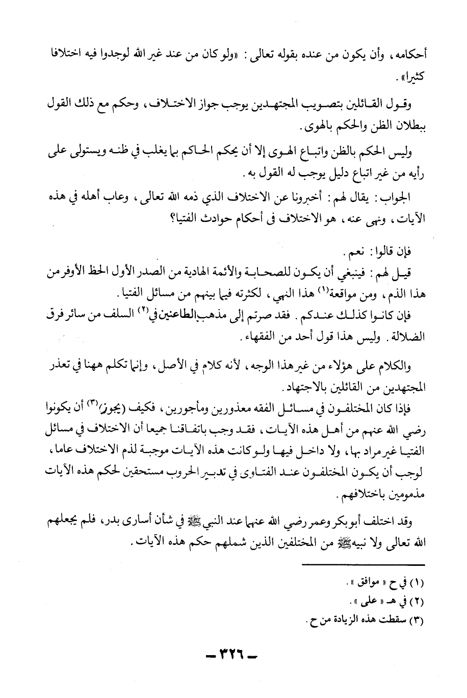 الْجَوَابُ: يُقَالُ لَهُمْ: أَخْبِرُونَا عَنْ الِاخْتِلَافِ الَّذِي ذَمَّهُ اللَّهُ تَعَالَى، وَعَابَ أَهْلَهُ فِي هَذِهِ الْآيَاتِ، وَنَهَى عَنْهُ، هُوَ الِاخْتِلَافُ فِي أَحْكَامِ حَوَادِثِ الْفُتْيَا؟ فَإِنْ قَالُوا: نَعَمْ. قِيلَ لَهُمْ: فَيَنْبَغِي أَنْ يَكُونَ لِلصَّحَابَةِ وَالْأَئِمَّةِ الْهَادِيَةِ مِنْ الصَّدْرِ الْأَوَّلِ الْحَظَّ الْأَوْفَرَ مِنْ هَذَا الذَّمِّ، وَمِنْ مُوَاقَعَةِ هَذَا النَّهْيِ، لِكَثْرَتِهِ فِيمَا بَيْنَهُمْ مِنْ مَسَائِلِ الْفُتْيَا. فَإِنْ كَانُوا كَذَلِكَ عِنْدَكُمْ. فَقَدْ صِرْتُمْ إلَى مَذْهَبِ الطَّاعِنِينَ فِي السَّلَفِ مِنْ سَائِرِ فِرَقِ الضَّلَالَةِ. وَلَيْسَ هَذَا قَوْلُ أَحَدٍ مِنْ الْفُقَهَاءِ. وَالْكَلَامُ عَلَى هَؤُلَاءِ مِنْ غَيْرِ هَذَا الْوَجْهِ، لِأَنَّهُ كَلَامٌ فِي الْأَصْلِ، وَإِنَّمَا تَكَلَّمَ هَهُنَا فِي تَعَذُّرِ الْمُجْتَهِدِينَ مِنْ الْقَائِلِينَ بِالِاجْتِهَادِ. فَإِذَا كَانَ الْمُخْتَلِفُونَ فِي مَسَائِلِ الْفِقْهِ مَعْذُورِينَ وَمَأْجُورِينَ، فَكَيْفَ (يَجُوزُ) أَنْ يَكُونُوا - رَضِيَ اللَّهُ عَنْهُمْ - مِنْ أَهْلِ هَذِهِ الْآيَاتِ، فَقَدْ وَجَبَ بِاتِّفَاقِنَا جَمِيعًا أَنَّ الِاخْتِلَافَ فِي مَسَائِلِ الْفُتْيَا غَيْرُ مُرَادٍ بِهَا، وَلَا دَاخِلٍ فِيهَا وَلَوْ كَانَتْ هَذِهِ الْآيَاتُ مُوجِبَةً لِذَمِّ الِاخْتِلَافِ عَامًّا، لَوَجَبَ أَنْ يَكُونَ الْمُخْتَلِفُونَ عِنْدَ الْفَتَاوَى فِي تَدْبِيرِ الْحُرُوبِ مُسْتَحِقِّينَ لِحُكْمِ هَذِهِ الْآيَاتِ مَذْمُومِينَ بِاخْتِلَافِهِمْ.
