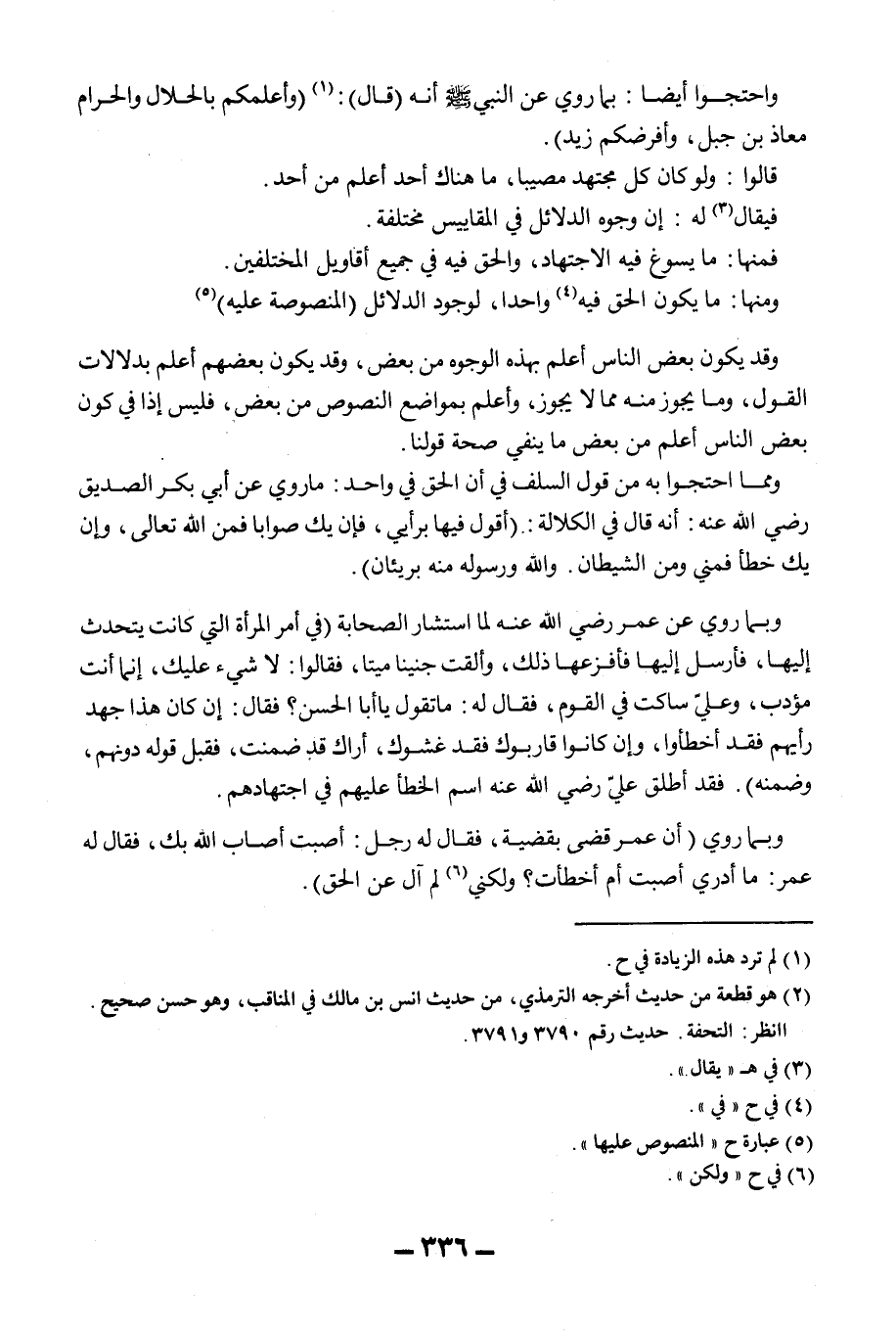 وَاحْتَجُّوا أَيْضًا: بِمَا رُوِيَ عَنْ النَّبِيِّ - صَلَّى اللَّهُ عَلَيْهِ وَسَلَّمَ - أَنَّهُ (قَالَ) : «وَأَعْلَمُكُمْ بِالْحَلَالِ وَالْحَرَامِ مُعَاذُ بْنُ جَبَلٍ، وَأَفْرَضُكُمْ زَيْدٌ» . قَالُوا: وَلَوْ كَانَ كُلُّ مُجْتَهِدٍ مُصِيبًا، مَا هُنَاكَ أَحَدٌ أَعْلَمُ مِنْ أَحَدٍ. فَيُقَالُ لَهُ: إنَّ وُجُوهَ الدَّلَائِلِ فِي الْمَقَايِيسِ مُخْتَلِفَةٌ. فَمِنْهَا: مَا يُسَوَّغُ فِيهِ الِاجْتِهَادُ، وَالْحَقُّ فِيهِ فِي جَمِيعِ أَقَاوِيلِ الْمُخْتَلِفِينَ. وَمِنْهَا: مَا يَكُونُ الْحَقُّ فِيهِ وَاحِدًا، لِوُجُودِ الدَّلَائِلِ (الْمَنْصُوصَةِ عَلَيْهِ) وَقَدْ يَكُونُ بَعْضُ النَّاسِ أَعْلَمَ بِهَذِهِ الْوُجُوهِ مِنْ بَعْضٍ، وَقَدْ يَكُونُ بَعْضُهُمْ أَعْلَمَ بِدَلَالَاتِ الْقَوْلِ، وَمَا يَجُوزُ مِنْهُ مِمَّا لَا يَجُوزُ، وَأَعْلَمُ بِمَوَاضِعِ النُّصُوصِ مِنْ بَعْضٍ، فَلَيْسَ إذًا فِي كَوْنِ بَعْضِ النَّاسِ أَعْلَمَ مِنْ بَعْضِ مَا يَنْفِي صِحَّةَ قَوْلِنَا.