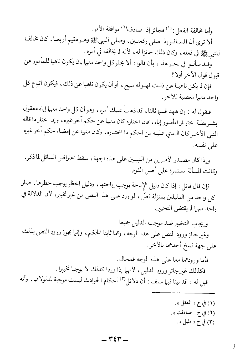 وَأَمَّا مُخَالَفَةُ الْفِعْلِ: فَجَائِزٌ إذَا صَادَفَ مُوَافَقَةَ الْأَمْرِ. أَلَا تَرَى أَنَّ الْمُسَافِرَ إذَا صَلَّى رَكْعَتَيْنِ، وَصَلَّى النَّبِيُّ - صَلَّى اللَّهُ عَلَيْهِ وَسَلَّمَ - وَهُوَ مُقِيمٌ أَرْبَعًا، كَانَ مُخَالِفًا لِلنَّبِيِّ - صَلَّى اللَّهُ عَلَيْهِ وَسَلَّمَ - فِي فِعْلِهِ، وَكَانَ ذَلِكَ جَائِزًا لَهُ، لِأَنَّهُ لَمْ يُخَالِفْهُ فِي أَمْرِهِ. وَقَدْ سَأَلُوا فِي نَحْوِ هَذَا، بِأَنْ قَالُوا: أَلَا يَخْلُو كُلُّ وَاحِدٍ مِنْهُمَا بِأَنْ يَكُونَ نَاهِيًا لِلْمَأْمُورِ عَنْ قَبُولِ قَوْلِ الْآخَرِ أَوْ لَا؟ فَإِنْ لَمْ يَكُنْ نَاهِيًا عَنْ ذَلِكَ فَهُوَ لَهُ مُبِيحٌ، أَوْ أَنْ يَكُونَ نَاهِيًا عَنْ ذَلِكَ، فَيَكُونُ اتِّبَاعُ كُلِّ وَاحِدٍ مِنْهُمَا مَعْصِيَةً لِلْآخَرِ. فَنَقُولُ لَهُ: إنْ هَهُنَا قِسْمًا ثَالِثًا، قَدْ ذَهَبَ عَلَيْك أَمْرُهُ، وَهُوَ أَنَّ كُلَّ وَاحِدٍ مِنْهُمَا إيَّاهُ مَعْقُولٌ بِشَرِيطَةِ اخْتِيَارِ الْمَأْمُورِ إيَّاهُ، فَإِنْ اخْتَارَهُ كَانَ مَنْهِيًّا عَنْ حُكْمِ آخَرَ غَيْرِهِ، وَإِنْ اخْتَارَ مَا قَالَهُ النَّبِيُّ الْآخَرُ كَانَ الَّذِي عَلَيْهِ مِنْ الْحُكْمِ مَا اخْتَارَهُ، وَكَانَ مَنْهِيًّا عَنْ إمْضَاءِ حُكْمِ آخَرَ غَيْرِهِ عَلَى نَفْسِهِ.