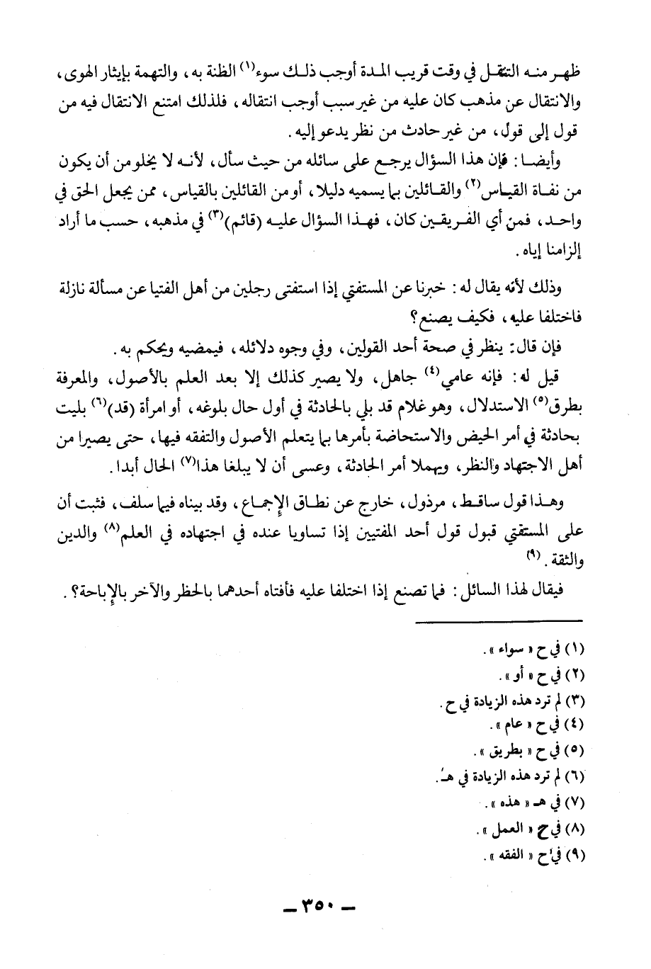 ظَهَرَ مِنْهُ التَّنَقُّلُ فِي وَقْتٍ قَرِيبِ الْمُدَّةِ أَوْجَبَ ذَلِكَ سُوءَ الظِّنَّةِ بِهِ، وَالتُّهْمَةَ بِإِيثَارِ الْهَوَى، وَالِانْتِقَالُ عَنْ مَذْهَبٍ كَانَ عَلَيْهِ مِنْ غَيْرِ سَبَبٍ أَوْجَبَ انْتِقَالَهُ، فَلِذَلِكَ امْتَنَعَ الِانْتِقَالُ فِيهِ مِنْ قَوْلٍ إلَى قَوْلٍ، مِنْ غَيْرِ حَادِثٍ مِنْ نَظَرٍ يَدْعُو إلَيْهِ. وَأَيْضًا: فَإِنَّ هَذَا السُّؤَالَ يَرْجِعُ عَلَى سَائِلِهِ مِنْ حَيْثُ سَأَلَ، لِأَنَّهُ لَا يَخْلُو مِنْ أَنْ يَكُونَ مِنْ نُفَاةِ الْقِيَاسِ وَالْقَائِلِينَ بِمَا يُسَمِّيه دَلِيلًا، أَوْ مِنْ الْقَائِلِينَ بِالْقِيَاسِ، مِمَّنْ يَجْعَلُ الْحَقَّ فِي وَاحِدٍ، فَمِنْ أَيِّ الْفَرِيقَيْنِ كَانَ، فَهَذَا السُّؤَالُ عَلَيْهِ (قَائِمٌ) فِي مَذْهَبِهِ، حَسَبَ مَا أَرَادَ إلْزَامَنَا إيَّاهُ. وَذَلِكَ لِأَنَّهُ يُقَالُ لَهُ: خَبِّرْنَا عَنْ الْمُسْتَفْتِي إذَا اسْتَفْتَى رَجُلَيْنِ مِنْ أَهْلِ الْفُتْيَا عَنْ مَسْأَلَةٍ نَازِلَةٍ فَاخْتَلَفَا عَلَيْهِ، فَكَيْفَ يَصْنَعُ؟ فَإِنْ قَالَ: يَنْظُرُ فِي صِحَّةِ أَحَدِ الْقَوْلَيْنِ، وَفِي وُجُوهِ دَلَائِلِهِ، فَيُمْضِيهِ وَيَحْكُمُ بِهِ. قِيلَ لَهُ: فَإِنَّهُ عَامِّيٌّ جَاهِلٌ، وَلَا يَصِيرُ كَذَلِكَ إلَّا بَعْدَ الْعِلْمِ بِالْأُصُولِ، وَالْمَعْرِفَةِ بِطُرُقِ الِاسْتِدْلَالِ، وَهُوَ غُلَامٌ قَدْ بُلِيَ بِالْحَادِثَةِ فِي أَوَّلِ حَالِ بُلُوغِهِ، أَوْ امْرَأَةٌ (قَدْ) بُلِيَتْ بِحَادِثَةٍ فِي أَمْرِ الْحَيْضِ وَالِاسْتِحَاضَةِ بِأَمْرِهَا بِمَا يَتَعَلَّمُ الْأُصُولَ وَالتَّفَقُّهَ فِيهَا، حَتَّى يَصِيرَا مِنْ أَهْلِ الِاجْتِهَادِ وَالنَّظَرِ، وَيُهْمِلَا أَمْرَ الْحَادِثَةِ، وَعَسَى أَنْ لَا يَبْلُغَا هَذَا الْحَالَ أَبَدًا. وَهَذَا قَوْلٌ سَاقِطٌ، مَرْذُولٌ، خَارِجٌ عَنْ نِطَاقِ الْإِجْمَاعِ، وَقَدْ بَيَّنَّاهُ فِيمَا سَلَفَ، فَثَبَتَ أَنَّ عَلَى الْمُسْتَفْتِي قَبُولَ قَوْلِ أَحَدِ الْمُفْتِيَيْنِ إذَا تَسَاوَيَا عِنْدَهُ فِي اجْتِهَادِهِ فِي الْعِلْمِ وَالدِّينِ وَالثِّقَةِ.