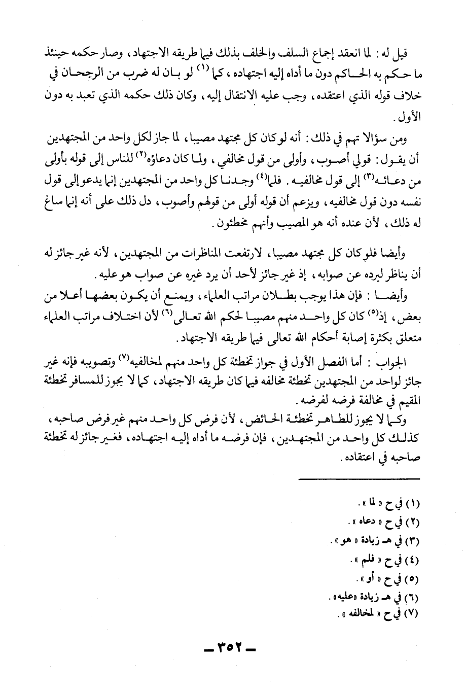 وَمِنْ سُؤَالَاتِهِمْ فِي ذَلِكَ: أَنَّهُ لَوْ كَانَ كُلُّ مُجْتَهِدٍ مُصِيبًا، لَمَّا جَازَ لِكُلِّ وَاحِدٍ مِنْ الْمُجْتَهِدِينَ أَنْ يَقُولَ: قَوْلِي أَصْوَبُ، وَأَوْلَى مِنْ قَوْلِ مُخَالِفِي، وَلَمَا كَانَ دُعَاؤُهُ لِلنَّاسِ إلَى قَوْلِهِ بِأَوْلَى مِنْ دُعَائِهِ إلَى قَوْلِ مُخَالِفِيهِ. فَلَمَّا وَجَدْنَا كُلَّ وَاحِدٍ مِنْ الْمُجْتَهِدِينَ إنَّمَا يَدْعُو إلَى قَوْلِ نَفْسِهِ دُونَ قَوْلِ مُخَالِفِيهِ، وَيَزْعُمُ أَنَّ قَوْلَهُ أَوْلَى مِنْ قَوْلِهِمْ وَأَصْوَبُ، دَلَّ ذَلِكَ عَلَى أَنَّهُ إنَّمَا سَاغَ لَهُ ذَلِكَ، لِأَنَّ عِنْدَهُ أَنَّهُ هُوَ الْمُصِيبُ وَأَنَّهُمْ مُخْطِئُونَ. وَأَيْضًا فَلَوْ كَانَ كُلُّ مُجْتَهِدٍ مُصِيبًا، لَارْتَفَعَتْ الْمُنَاظَرَاتُ مِنْ الْمُجْتَهِدِينَ، لِأَنَّهُ غَيْرُ جَائِزٍ لَهُ أَنْ يُنَاظِرَ لِيَرُدَّهُ عَنْ صَوَابِهِ، إذْ غَيْرُ جَائِزٍ لِأَحَدٍ أَنْ يَرُدَّ غَيْرَهُ عَنْ صَوَابٍ هُوَ عَلَيْهِ. وَأَيْضًا: فَإِنَّ هَذَا يُوجِبُ بُطْلَانَ مَرَاتِبِ الْعُلَمَاءِ، وَيَمْنَعُ أَنْ يَكُونَ بَعْضُهَا أَعْلَى مِنْ بَعْضٍ، إذْ كَانَ كُلُّ وَاحِدٍ مِنْهُمْ مُصِيبًا لِحُكْمِ اللَّهِ تَعَالَى لِأَنَّ اخْتِلَافَ مَرَاتِبِ الْعُلَمَاءِ مُتَعَلِّقٌ بِكَثْرَةِ إصَابَةِ أَحْكَامِ اللَّهِ تَعَالَى فِيمَا طَرِيقُهُ الِاجْتِهَادُ. الْجَوَابُ: أَمَّا الْفَصْلُ الْأَوَّلُ فِي جَوَازِ تَخْطِئَةِ كُلِّ وَاحِدٍ مِنْهُمْ لِمُخَالِفِيهِ وَتَصْوِيبُهُ فَإِنَّهُ غَيْرُ جَائِزٍ لِوَاحِدٍ مِنْ الْمُجْتَهِدِينَ تَخْطِئَةُ مُخَالِفِهِ فِيمَا كَانَ طَرِيقُهُ الِاجْتِهَادُ، كَمَا لَا يَجُوزُ لِلْمُسَافِرِ تَخْطِئَةُ الْمُقِيمِ فِي مُخَالَفَةِ فَرْضِهِ لِفَرْضِهِ. وَكَمَا لَا يَجُوزُ لِلطَّاهِرِ تَخْطِئَةُ الْحَائِضِ، لِأَنَّ فَرْضَ كُلِّ وَاحِدٍ مِنْهُمْ غَيْرُ فَرْضِ صَاحِبِهِ، كَذَلِكَ كُلُّ وَاحِدٍ مِنْ الْمُجْتَهِدِينَ، فَإِنَّ فَرْضَهُ مَا أَدَّاهُ إلَيْهِ اجْتِهَادُهُ، فَغَيْرُ جَائِزٍ لَهُ تَخْطِئَةُ صَاحِبِهِ فِي اعْتِقَادِهِ.