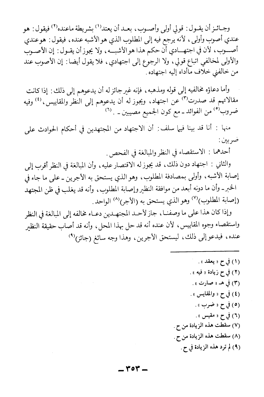 وَجَائِزٌ أَنْ يَقُولَ: قَوْلِي أَوْلَى وَأَصْوَبُ، بَعْدَ أَنْ يَعْتَدَّ بِشَرِيطَةِ مَا عِنْدَهُ فَيَقُولُ: هُوَ عِنْدِي أَصْوَبُ وَأَوْلَى، لِأَنَّهُ يَرْجِعُ فِيهِ إلَى الْمَطْلُوبِ الَّذِي هُوَ الْأَشْبَهُ عِنْدَهُ، فَيَقُولُ: هُوَ عِنْدِي أَصْوَبُ، لِأَنَّ فِي اجْتِهَادِي أَنَّ حُكْمَ هَذَا هُوَ الْأَشْبَهُ، وَلَا يَجُوزُ أَنْ يَقُولَ: إنَّ الْأَصْوَبَ وَالْأَوْلَى لِمُخَالِفِي اتِّبَاعُ قَوْلِي، وَلَا الرُّجُوعُ إلَى اجْتِهَادِي، فَلَا يَقُولُ أَيْضًا: إنَّ الْأَصْوَبَ عِنْدَ مَنْ خَالَفَنِي خِلَافُ مَا أَدَّاهُ إلَيْهِ اجْتِهَادُهُ. وَأَمَّا دُعَاؤُهُ مُخَالِفِيهِ إلَى قَوْلِهِ وَمَذْهَبِهِ، فَإِنَّهُ غَيْرُ جَائِزٍ لَهُ أَنْ يَدْعُوَهُمْ إلَى ذَلِكَ: إذَا كَانَتْ مَقَالَاتُهُمْ قَدْ صَدَرَتْ عَنْ اجْتِهَادٍ، وَيَجُوزُ لَهُ أَنْ يَدْعُوَهُمْ إلَى النَّظَرِ وَالْمَقَايِيسِ، وَفِيهِ ضُرُوبٌ مِنْ الْفَوَائِدِ - مَعَ كَوْنِ الْجَمِيعِ مُصِيبِينَ -. مِنْهَا: أَنَّا قَدْ بَيَّنَّا فِيمَا سَلَفَ: أَنَّ الِاجْتِهَادَ مِنْ الْمُجْتَهِدِينَ فِي أَحْكَامِ الْحَوَادِثِ عَلَى ضَرْبَيْنِ: