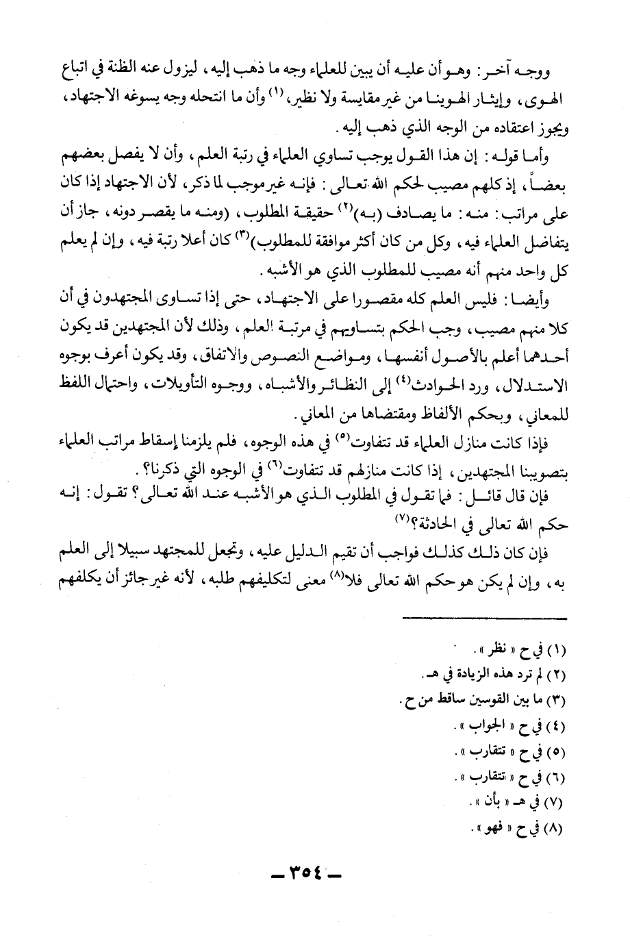 وَوَجْهٌ آخَرُ: وَهُوَ أَنَّ عَلَيْهِ أَنْ يُبَيِّنَ لِلْعُلَمَاءِ وَجْهَ مَا ذَهَبَ إلَيْهِ، لِيَزُولَ عَنْهُ الظِّنَّةُ فِي اتِّبَاعِ الْهَوَى، وَإِيثَارِ الْهُوَيْنَا مِنْ غَيْرِ مُقَايَسَةٍ وَلَا نَظِيرٍ، وَأَنَّ مَا انْتَحَلَهُ وَجْهٌ يُسَوِّغُهُ الِاجْتِهَادُ، وَيَجُوزُ اعْتِقَادُهُ مِنْ الْوَجْهِ الَّذِي ذَهَبَ إلَيْهِ. وَأَمَّا قَوْلُهُ: إنَّ هَذَا الْقَوْلَ يُوجِبُ تُسَاوِي الْعُلَمَاءِ فِي رُتْبَةِ الْعِلْمِ، وَأَنْ لَا يَفْضُلَ بَعْضُهُمْ بَعْضًا، إذْ كُلُّهُمْ مُصِيبٌ لِحُكْمِ اللَّهِ تَعَالَى: فَإِنَّهُ غَيْرُ مُوجِبٍ لِمَا ذُكِرَ، لِأَنَّ الِاجْتِهَادَ إذَا كَانَ عَلَى مَرَاتِبَ: مِنْهُ: مَا يُصَادِفُ (بِهِ) حَقِيقَةَ الْمَطْلُوبِ (وَمِنْهُ مَا يَقْصُرُ دُونَهُ، جَازَ أَنْ يَتَفَاضَلَ الْعُلَمَاءُ فِيهِ، وَكُلُّ مَنْ كَانَ أَكْثَرَ مُوَافَقَةً لِلْمَطْلُوبِ) كَانَ أَعْلَى رُتْبَةً فِيهِ، وَإِنْ لَمْ يَعْلَمْ كُلُّ وَاحِدٍ مِنْهُمْ أَنَّهُ مُصِيبٌ لِلْمَطْلُوبِ الَّذِي هُوَ الْأَشْبَهُ. وَأَيْضًا: فَلَيْسَ الْعِلْمُ كُلُّهُ مَقْصُورًا عَلَى الِاجْتِهَادِ، حَتَّى إذَا تَسَاوَى الْمُجْتَهِدُونَ فِي أَنَّ كُلًّا مِنْهُمْ مُصِيبٌ، وَجَبَ الْحُكْمُ بِتَسَاوِيهِمْ فِي مَرْتَبَةِ الْعِلْمِ، وَذَلِكَ لِأَنَّ الْمُجْتَهِدِينَ قَدْ يَكُونُ أَحَدُهُمَا أَعْلَمَ بِالْأُصُولِ أَنْفُسِهَا، وَمَوَاضِعِ النُّصُوصِ وَالِاتِّفَاقِ، وَقَدْ يَكُونُ أَعْرَفَ بِوُجُوهِ الِاسْتِدْلَالِ، وَرَدِّ الْحَوَادِثِ إلَى النَّظَائِرِ وَالْأَشْبَاهِ، وَوُجُوهِ التَّأْوِيلَاتِ، وَاحْتِمَالِ اللَّفْظِ لِلْمَعَانِي، وَبِحُكْمِ الْأَلْفَاظِ وَمُقْتَضَاهَا مِنْ الْمَعَانِي. فَإِذَا كَانَتْ مَنَازِلُ الْعُلَمَاءِ قَدْ تَتَفَاوَتُ فِي هَذِهِ الْوُجُوهِ، فَلَمْ يَلْزَمْنَا إسْقَاطُ مَرَاتِبِ الْعُلَمَاءِ بِتَصْوِيبِنَا الْمُجْتَهِدِينَ، إذَا كَانَتْ مَنَازِلُهُمْ قَدْ تَتَفَاوَتُ فِي الْوُجُوهِ الَّتِي ذَكَرْنَا؟ . فَإِنْ قَالَ قَائِلٌ: فَمَا تَقُولُ فِي الْمَطْلُوبِ الَّذِي هُوَ الْأَشْبَهُ عِنْدَ اللَّهِ تَعَالَى؟ تَقُولُ: إنَّهُ حُكْمُ اللَّهِ تَعَالَى فِي الْحَادِثَةِ؟ فَإِنْ كَانَ ذَلِكَ كَذَلِكَ فَوَاجِبٌ أَنْ تُقِيمَ الدَّلِيلَ عَلَيْهِ، وَتَجْعَلَ لِلْمُجْتَهِدِ سَبِيلًا إلَى الْعِلْمِ بِهِ، وَإِنْ لَمْ يَكُنْ هُوَ حُكْمَ اللَّهِ تَعَالَى فَلَا مَعْنَى لِتَكْلِيفِهِمْ طَلَبَهُ، لِأَنَّهُ غَيْرُ جَائِزٍ أَنْ يُكَلِّفَهُمْ