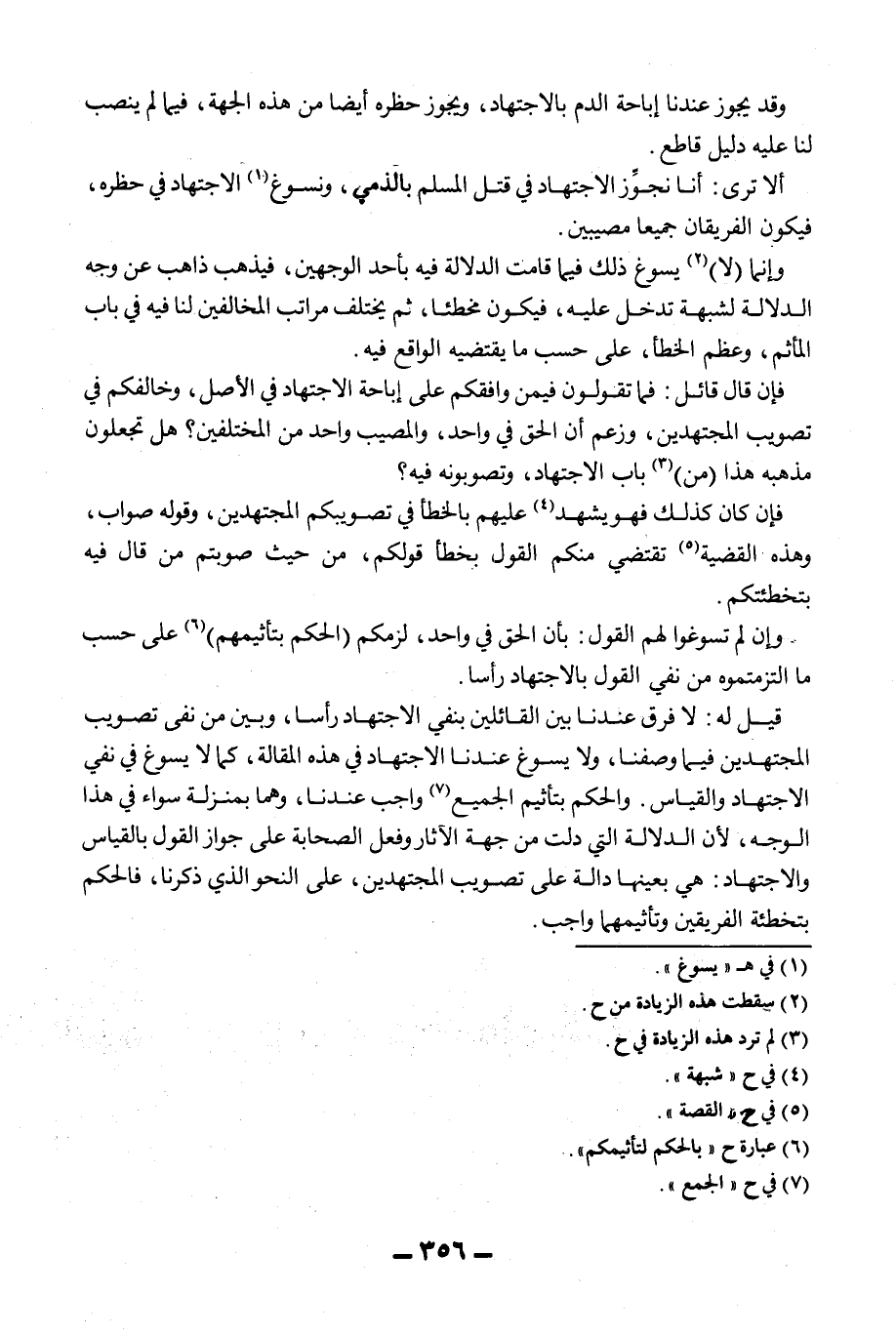 أَلَا تَرَى: أَنَّا نُجَوِّزُ الِاجْتِهَادَ فِي قَتْلِ الْمُسْلِمِ بِالذِّمِّيِّ، وَنُسَوِّغُ الِاجْتِهَادَ فِي حَظْرِهِ، فَيَكُونُ الْفَرِيقَانِ جَمِيعًا مُصِيبِينَ. وَإِنَّمَا (لَا) يُسَوَّغُ ذَلِكَ فِيمَا قَامَتْ الدَّلَالَةُ فِيهِ بِأَحَدِ الْوَجْهَيْنِ، فَيَذْهَبُ ذَاهِبٌ عَنْ وَجْهِ الدَّلَالَةِ لِشُبْهَةٍ تَدْخُلُ عَلَيْهِ، فَيَكُونُ مُخْطِئًا، ثُمَّ يَخْتَلِفُ مَرَاتِبُ الْمُخَالِفِينَ لَنَا فِيهِ فِي بَابِ الْمَأْثَمِ، وَعِظَمِ الْخَطَأِ، عَلَى حَسَبِ مَا يَقْتَضِيه الْوَاقِعُ فِيهِ. فَإِنْ قَالَ قَائِلٌ: فَمَا تَقُولُونَ فِيمَنْ وَافَقَكُمْ عَلَى إبَاحَةِ الِاجْتِهَادِ فِي الْأَصْلِ، وَخَالَفَكُمْ فِي تَصْوِيبِ الْمُجْتَهِدِينَ، وَزَعَمَ أَنَّ الْحَقَّ فِي وَاحِدٍ، وَالْمُصِيبُ وَاحِدٌ مِنْ الْمُخْتَلِفِينَ؟ هَلْ تَجْعَلُونَ مَذْهَبَهُ هَذَا (مِنْ) بَابِ الِاجْتِهَادِ، وَتُصَوِّبُونَهُ فِيهِ؟ فَإِنْ كَانَ كَذَلِكَ فَهُوَ يَشْهَدُ عَلَيْهِمْ بِالْخَطَأِ فِي تَصْوِيبِكُمْ الْمُجْتَهِدِينَ، وَقَوْلُهُ صَوَابٌ، وَهَذِهِ الْقَضِيَّةُ تَقْتَضِي مِنْكُمْ الْقَوْلَ بِخَطَأِ قَوْلِكُمْ، مِنْ حَيْثُ صَوَّبْتُمْ مَنْ قَالَ فِيهِ بِتَخْطِئَتِكُمْ. وَإِنْ لَمْ تُسَوِّغُوا لَهُمْ الْقَوْلَ: بِأَنَّ الْحَقَّ فِي وَاحِدٍ، لَزِمَكُمْ (الْحُكْمُ بِتَأْثِيمِهِمْ) عَلَى حَسَبِ مَا الْتَزَمْتُمُوهُ مِنْ نَفْيِ الْقَوْلِ بِالِاجْتِهَادِ رَأْسًا. قِيلَ لَهُ: لَا فَرْقَ عِنْدَنَا بَيْنَ الْقَائِلِينَ بِنَفْيِ الِاجْتِهَادِ رَأْسًا، وَبَيْنَ مَنْ نَفَى تَصْوِيبَ الْمُجْتَهِدِينَ فِيمَا وَصَفْنَا، وَلَا يُسَوَّغُ عِنْدَنَا الِاجْتِهَادُ فِي هَذِهِ الْمَقَالَةِ، كَمَا لَا يُسَوَّغُ فِي نَفْيِ الِاجْتِهَادِ وَالْقِيَاسِ. وَالْحُكْمُ بِتَأْثِيمِ الْجَمِيعِ وَاجِبٌ عِنْدَنَا، وَهُمَا بِمَنْزِلَةٍ سَوَاءٌ فِي هَذَا الْوَجْهِ، لِأَنَّ الدَّلَالَةَ الَّتِي دَلَّتْ مِنْ جِهَةِ الْآثَارِ وَفِعْلِ الصَّحَابَةِ عَلَى جَوَازِ الْقَوْلِ بِالْقِيَاسِ وَالِاجْتِهَادِ: هِيَ بِعَيْنِهَا دَالَّةٌ عَلَى تَصْوِيبِ الْمُجْتَهِدِينَ، عَلَى النَّحْوِ الَّذِي ذَكَرْنَا، فَالْحُكْمُ بِتَخْطِئَةِ الْفَرِيقَيْنِ وَتَأْثِيمِهِمَا وَاجِبٌ.