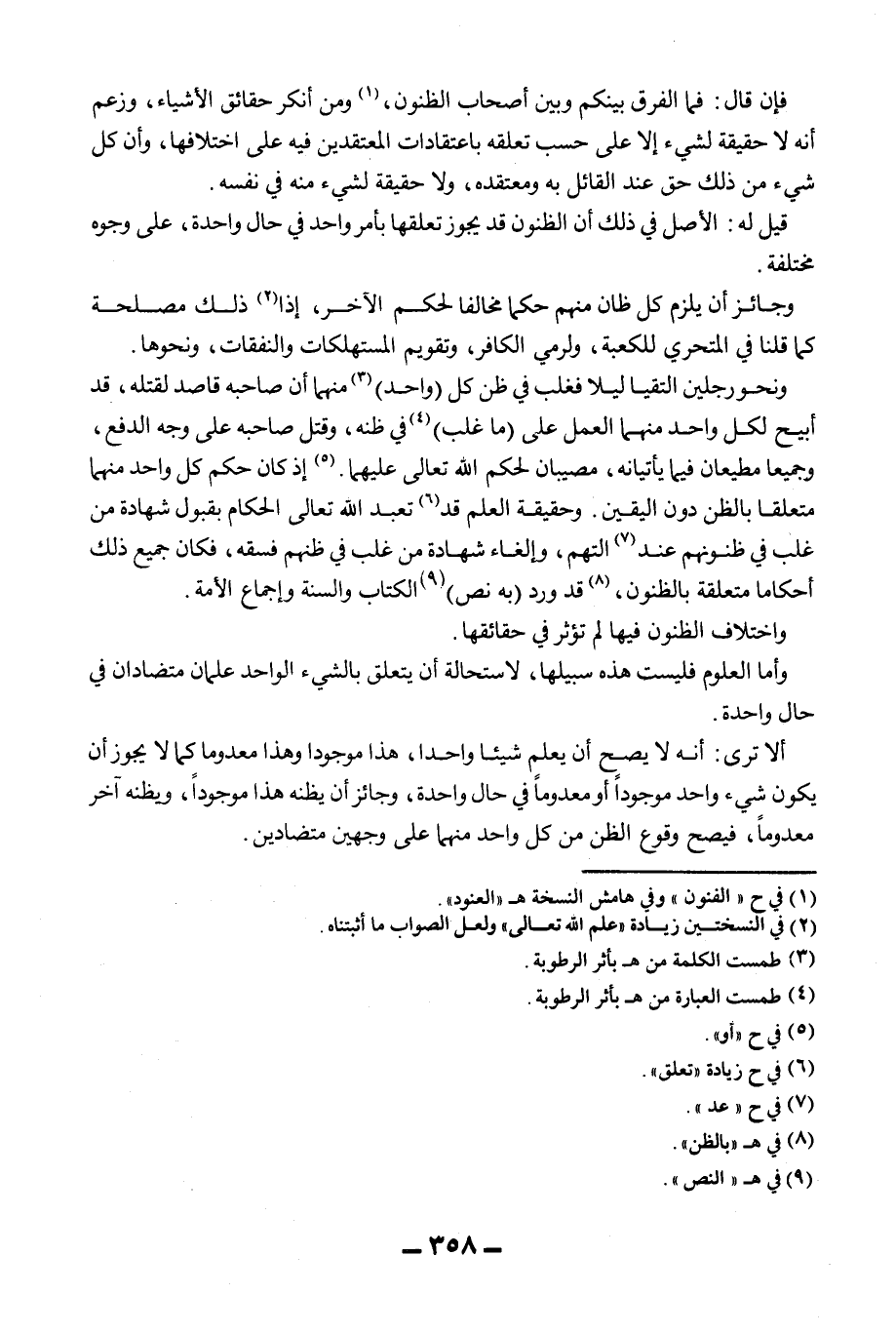 أَلَا تَرَى: أَنَّهُ لَا يَصِحُّ أَنْ يَعْلَمَ شَيْئًا وَاحِدًا، هَذَا مَوْجُودًا وَهَذَا مَعْدُومًا كَمَا لَا يَجُوزُ أَنْ يَكُونَ شَيْءٌ وَاحِدٌ مَوْجُودًا أَوْ مَعْدُومًا فِي حَالٍ وَاحِدَةٍ، وَجَائِزٌ أَنْ يَظُنَّهُ هَذَا مَوْجُودًا، وَيَظُنَّهُ آخَرُ مَعْدُومًا، فَيَصِحُّ وُقُوعُ الظَّنِّ مِنْ كُلِّ وَاحِدٍ مِنْهُمَا عَلَى وَجْهَيْنِ مُتَضَادَّيْنِ.