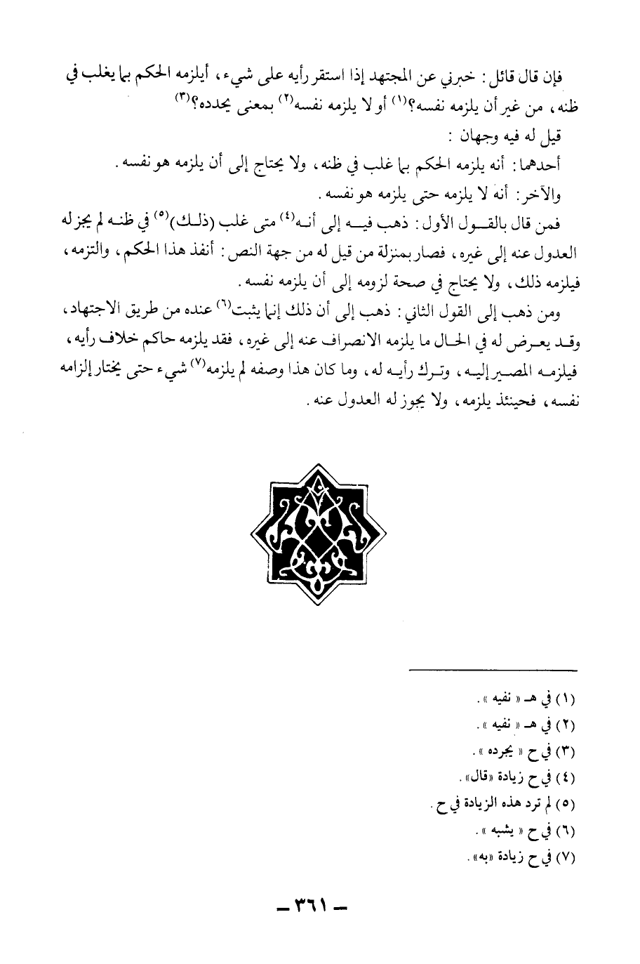 فَإِنْ قَالَ قَائِلٌ: خَبِّرْنِي عَنْ الْمُجْتَهِدِ إذَا اسْتَقَرَّ رَأْيُهُ عَلَى شَيْءٍ، أَيَلْزَمُهُ الْحُكْمُ بِمَا يَغْلِبُ فِي ظَنِّهِ، مِنْ غَيْرِ أَنْ يُلْزِمَهُ نَفْسَهُ؟ أَوْ لَا يُلْزِمَهُ نَفْسَهُ بِمَعْنًى يُحَدِّدُهُ؟ قِيلَ لَهُ فِيهِ وَجْهَانِ: أَحَدُهُمَا: أَنَّهُ يَلْزَمُهُ الْحُكْمُ بِمَا غَلَبَ فِي ظَنِّهِ، وَلَا يَحْتَاجُ إلَى أَنْ يُلْزِمَهُ هُوَ نَفْسَهُ. وَالْآخَرُ: أَنْ لَا يَلْزَمَهُ حَتَّى يُلْزِمَهُ هُوَ نَفْسَهُ. فَمَنْ قَالَ بِالْقَوْلِ الْأَوَّلِ: ذَهَبَ فِيهِ إلَى أَنَّهُ مَتَى غَلَبَ (ذَلِكَ) فِي ظَنِّهِ لَمْ يَجُزْ لَهُ الْعُدُولُ عَنْهُ إلَى غَيْرِهِ، فَصَارَ بِمَنْزِلَةِ مَنْ قِيلَ لَهُ مِنْ جِهَةِ النَّصِّ: أُنَفِّذُ هَذَا الْحُكْمَ، وَالْتَزَمَهُ، فَيَلْزَمُهُ ذَلِكَ، وَلَا يَحْتَاجُ فِي صِحَّةِ لُزُومِهِ إلَى أَنْ يُلْزِمَهُ نَفْسَهُ. وَمَنْ ذَهَبَ إلَى الْقَوْلِ الثَّانِي: ذَهَبَ إلَى أَنَّ ذَلِكَ إنَّمَا يَثْبُتُ عِنْدَهُ مِنْ طَرِيقِ الِاجْتِهَادِ، وَقَدْ يَعْرِضُ لَهُ فِي الْحَالِ مَا يَلْزَمُهُ الِانْصِرَافُ عَنْهُ إلَى غَيْرِهِ، فَقَدْ يُلْزِمُهُ حَاكِمٌ خِلَافَ رَأْيِهِ، فَيَلْزَمُهُ الْمَصِيرُ إلَيْهِ، وَتَرْكُ رَأْيِهِ لَهُ، وَمَا كَانَ هَذَا وَصْفُهُ لَمْ يَلْزَمْهُ شَيْءٌ يَخْتَارُ إلْزَامَهُ نَفْسَهُ، فَحِينَئِذٍ يَلْزَمُهُ، وَلَا يَجُوزُ لَهُ الْعُدُولُ عَنْهُ.