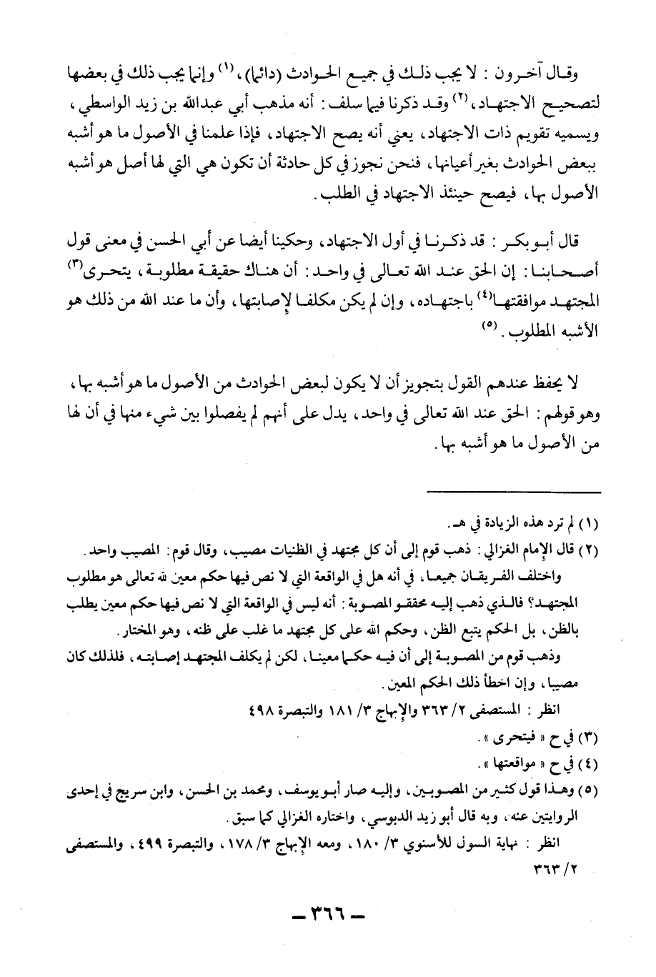وَقَالَ آخَرُونَ: لَا يَجِبُ ذَلِكَ فِي جَمِيعِ الْحَوَادِثِ (دَائِمًا) ، وَإِنَّمَا يَجِبُ ذَلِكَ فِي بَعْضِهَا لِتَصْحِيحِ الِاجْتِهَادِ، وَقَدْ ذَكَرْنَا فِيمَا سَلَفَ: أَنَّهُ مَذْهَبُ أَبِي عَبْدِ اللَّهِ بْنِ زَيْدٍ الْوَاسِطِيِّ، وَيُسَمِّيه تَقْوِيمَ ذَاتِ الِاجْتِهَادِ، يَعْنِي أَنَّهُ يَصِحُّ الِاجْتِهَادُ، فَإِذَا عَلِمْنَا فِي الْأُصُولِ مَا هُوَ أَشْبَهُ بِبَعْضِ الْحَوَادِثِ بِغَيْرِ أَعْيَانِهَا، فَنَحْنُ نُجَوِّزُ فِي كُلِّ حَادِثَةٍ أَنْ تَكُونَ هِيَ الَّتِي لَهَا أَصْلٌ هُوَ أَشْبَهُ الْأُصُولِ بِهَا، فَيَصِحُّ حِينَئِذٍ الِاجْتِهَادُ فِي الطَّلَبِ.