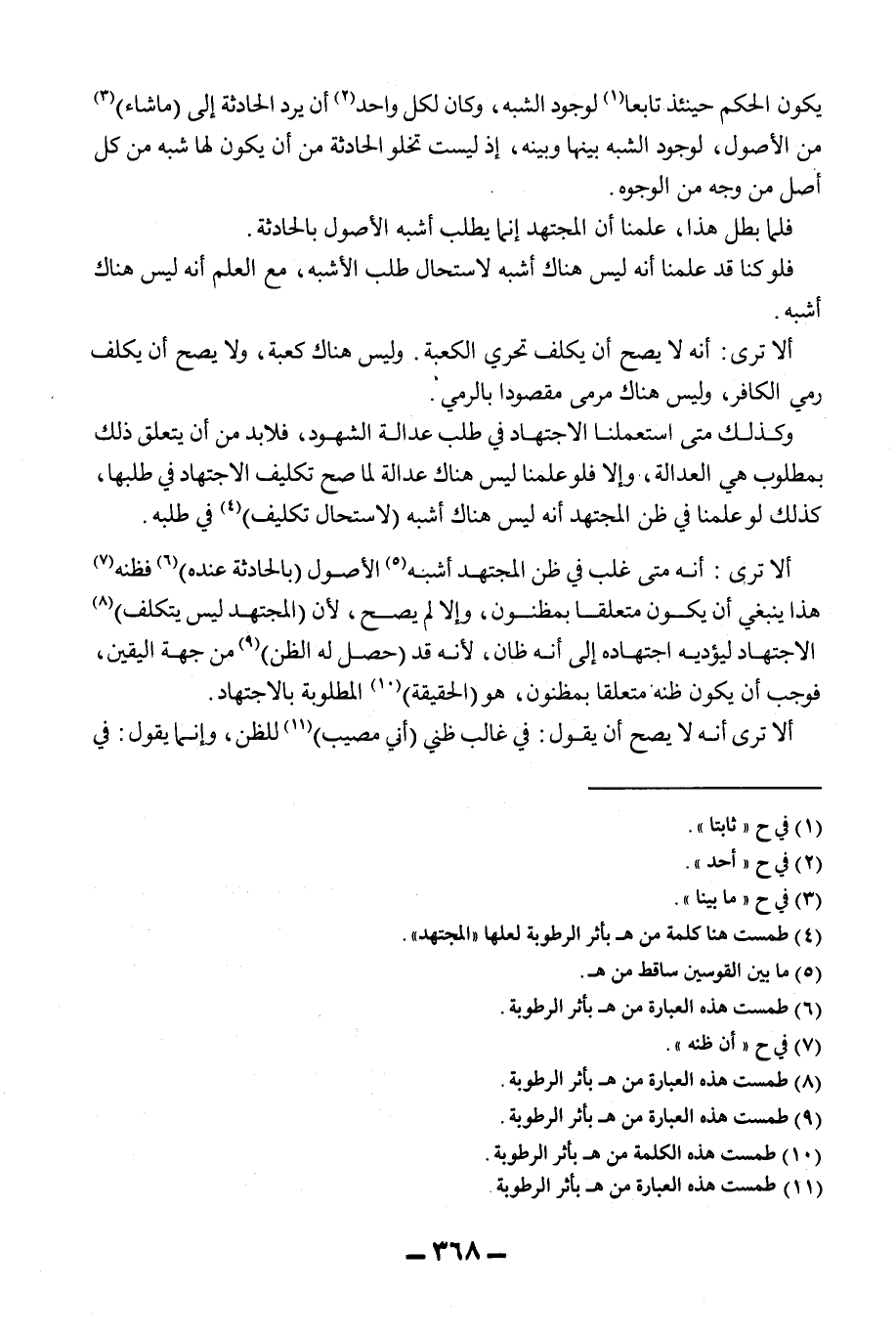 وَكَذَلِكَ مَتَى اسْتَعْمَلْنَا الِاجْتِهَادَ فِي طَلَبِ عَدَالَةِ الشُّهُودِ، فَلَا بُدَّ مِنْ أَنْ يَتَعَلَّقَ ذَلِكَ بِمَطْلُوبٍ هِيَ الْعَدَالَةُ، وَإِلَّا فَلَوْ عَلِمْنَا لَيْسَ هُنَاكَ عَدَالَةٌ لَمَا صَحَّ تَكْلِيفُ الِاجْتِهَادِ فِي طَلَبِهَا، كَذَلِكَ لَوْ عَلِمْنَا فِي ظَنِّ الْمُجْتَهِدِ أَنَّهُ لَيْسَ هُنَاكَ أَشْبَهُ (لَاسْتَحَالَ تَكْلِيفٌ) فِي طَلَبِهِ.