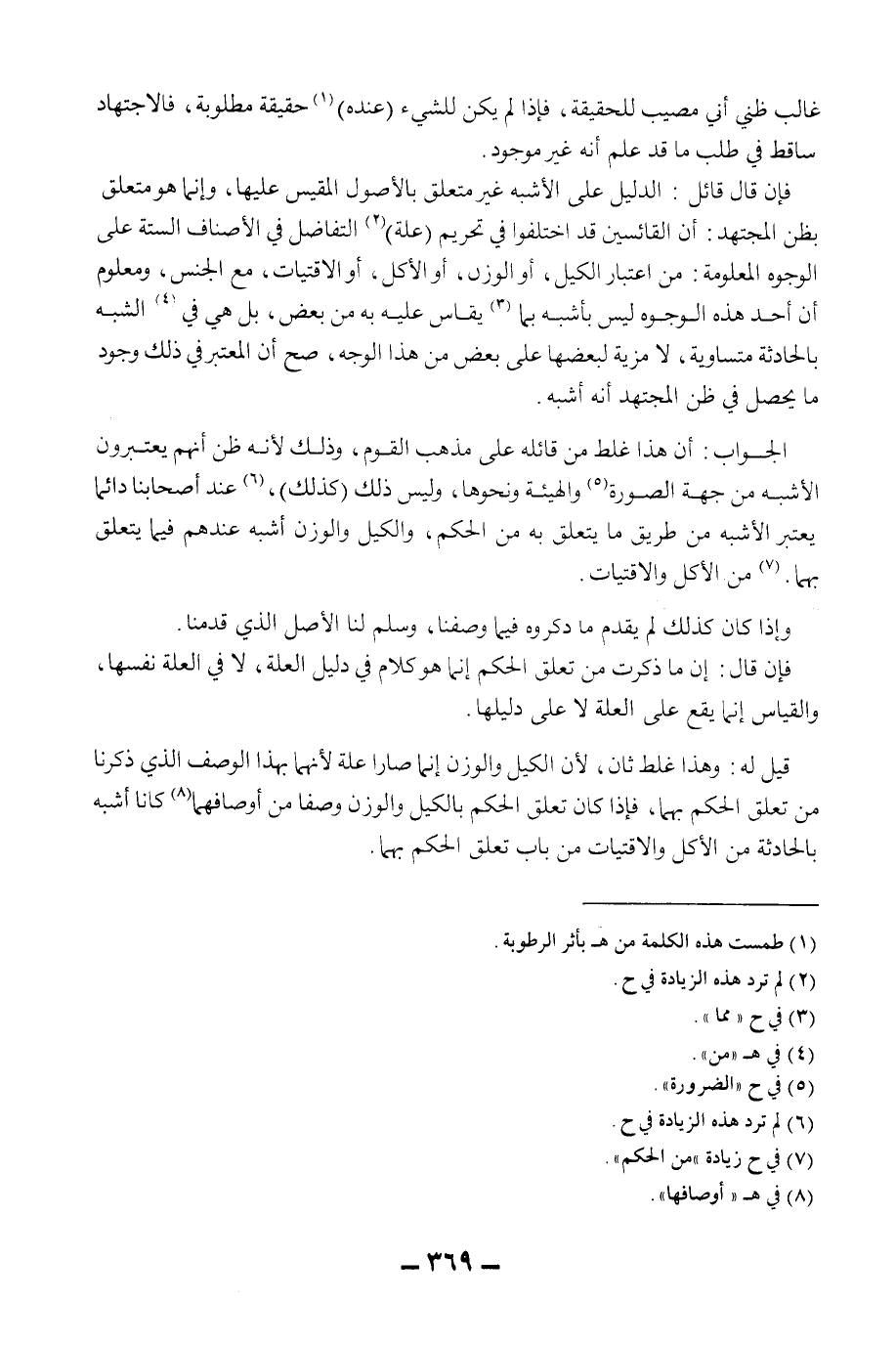 فَإِنْ قَالَ قَائِلٌ: الدَّلِيلُ عَلَى الْأَشْبَهِ غَيْرُ مُتَعَلِّقٍ بِالْأُصُولِ الْمَقِيسِ عَلَيْهَا، وَإِنَّمَا هُوَ مُتَعَلِّقٌ بِظَنِّ الْمُجْتَهِدِ: أَنَّ الْقَائِسِينَ قَدْ اخْتَلَفُوا فِي تَحْرِيمِ (عِلَّةِ) التَّفَاضُلِ فِي الْأَصْنَافِ السِّتَّةِ عَلَى الْوُجُوهِ الْمَعْلُومَةِ: مِنْ اعْتِبَارِ الْكَيْلِ، أَوْ الْوَزْنِ، أَوْ الْأَكْلِ، أَوْ الِاقْتِيَاتِ، مَعَ الْجِنْسِ، وَمَعْلُومٌ أَنَّ أَحَدَ هَذِهِ الْوُجُوهِ لَيْسَ بِأَشْبَهَ بِمَا يُقَاسُ عَلَيْهِ بِهِ مِنْ بَعْضٍ، بَلْ هِيَ فِي الشَّبَهِ بِالْحَادِثَةِ مُتَسَاوِيَةٌ، لَا مَزِيَّةَ لِبَعْضِهَا عَلَى بَعْضٍ مِنْ هَذَا الْوَجْهِ، صَحَّ أَنَّ الْمُعْتَبَرَ فِي ذَلِكَ وُجُودُ مَا يَحْصُلُ فِي ظَنِّ الْمُجْتَهِدِ أَنَّهُ أَشْبَهَ.