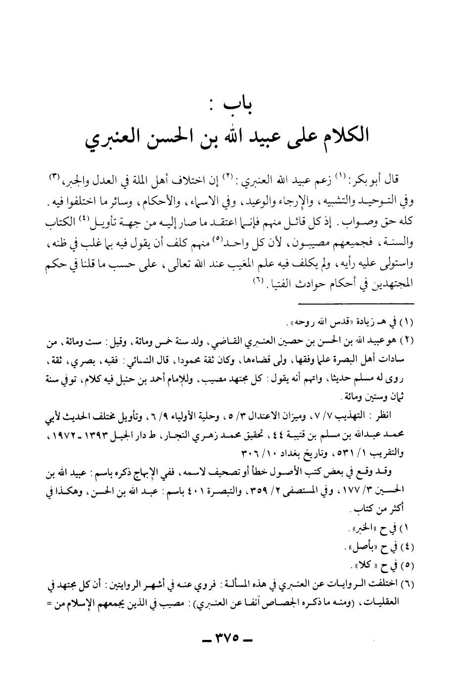 ِّ قَالَ أَبُو بَكْرٍ: زَعَمَ عُبَيْدُ اللَّهِ الْعَنْبَرِيُّ: أَنَّ اخْتِلَافَ أَهْلِ الْمِلَّةِ فِي الْعَدْلِ وَالْجَبْرِ، وَفِي التَّوْحِيدِ وَالتَّشْبِيهِ، وَالْإِرْجَاءِ وَالْوَعِيدِ، وَفِي الْأَسْمَاءِ، وَالْأَحْكَامِ، وَسَائِرِ مَا اخْتَلَفُوا فِيهِ. كُلُّهُ حَقٌّ وَصَوَابٌ. إذْ كُلُّ قَائِلٍ مِنْهُمْ فَإِنَّمَا اعْتَقَدَ مَا صَارَ إلَيْهِ مِنْ جِهَةِ تَأْوِيلِ الْكِتَابِ وَالسُّنَّةِ، فَجَمِيعُهُمْ مُصِيبُونَ، لِأَنَّ كُلَّ وَاحِدٍ مِنْهُمْ كُلِّفَ أَنْ يَقُولَ فِيهِ بِمَا غَلَبَ فِي ظَنِّهِ، وَاسْتَوْلَى عَلَيْهِ رَأْيُهُ، وَلَمْ يُكَلَّفْ فِيهِ عِلْمَ الْمُغَيَّبِ عِنْدَ اللَّهِ تَعَالَى، عَلَى حَسَبِ مَا قُلْنَا فِي حُكْمِ الْمُجْتَهِدِينَ فِي أَحْكَامِ حَوَادِثِ الْفُتْيَا.
