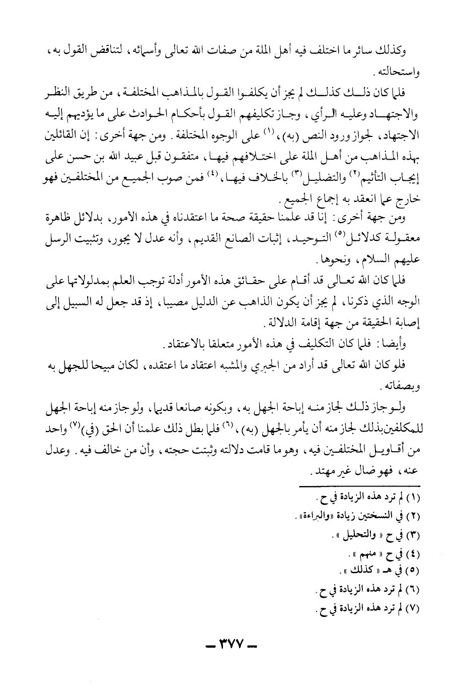 فَلَمَّا كَانَ ذَلِكَ كَذَلِكَ لَمْ يَجُزْ أَنْ يُكَلَّفُوا الْقَوْلَ بِالْمَذَاهِبِ الْمُخْتَلِفَةِ، مِنْ طَرِيقِ النَّظَرِ وَالِاجْتِهَادِ وَعَلَيْهِ الرَّأْيُ، وَجَازَ تَكْلِيفُهُمْ الْقَوْلَ بِأَحْكَامِ الْحَوَادِثِ عَلَى مَا يُؤَدِّيهِمْ إلَيْهِ الِاجْتِهَادُ، لِجَوَازِ وُرُودِ النَّصِّ (بِهِ) ، عَلَى الْوُجُوهِ الْمُخْتَلِفَةِ. وَمِنْ جِهَةٍ أُخْرَى: إنَّ الْقَائِلِينَ بِهَذِهِ الْمَذَاهِبِ مِنْ أَهْلِ الْمِلَّةِ عَلَى اخْتِلَافِهِمْ فِيهَا، مُتَّفِقُونَ قَبْلَ عُبَيْدِ اللَّهِ بْنِ حَسَنٍ عَلَى إيجَابِ التَّأْثِيمِ وَالتَّضْلِيلِ بِالْخِلَافِ فِيهَا، فَمَنْ صَوَّبَ الْجَمِيعَ مِنْ الْمُخْتَلِفِينَ فَهُوَ خَارِجٌ عَمَّا انْعَقَدَ بِهِ إجْمَاعُ الْجَمِيعِ.