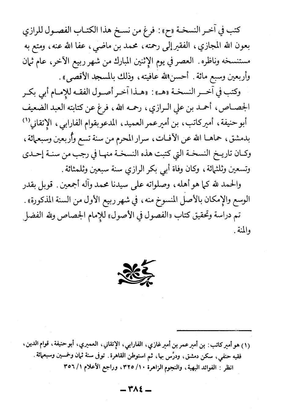 وَكَتَبَ فِي آخِرِ النُّسْخَةِ " هـ ": " هَذَا آخِرُ أُصُولِ الْفِقْهِ لِلْإِمَامِ أَبِي بَكْرٍ الْجَصَّاصِ أَحْمَدَ بْنِ عَلِيٍّ الرَّازِيِّ، - رَحِمَهُ اللَّهُ -، فَرَغَ عَنْ كِتَابَتِهِ الْعَبْدُ الضَّعِيفُ أَبُو حَنِيفَةَ، أَمِيرُ كَاتِبِ بْنِ أَمِيرِ عُمَرَ الْعَمِيدِ الْمَدْعُوّ بِقِوَامِ الْفَارَابِيِّ الْأَتْقَانِيِّ بِدِمَشْقَ، حَمَاهَا اللَّهُ عَنْ الْآفَاتِ، سِرَارَ الْمُحَرَّمِ مِنْ سَنَةِ تِسْعٍ وَأَرْبَعِينَ وَسَبْعِمِائَةٍ، وَكَانَ تَارِيخُ النُّسْخَةِ الَّتِي كُتِبَتْ هَذِهِ النُّسْخَةُ مِنْهَا فِي رَجَبٍ مِنْ سَنَةِ إحْدَى وَتِسْعِينَ وَثَلَثِمِائَةٍ، وَكَانَ وَفَاةُ أَبِي بَكْرٍ الرَّازِيِّ سَنَةَ سَبْعِينَ وَثَلَثِمِائَةٍ. وَالْحَمْدُ لِلَّهِ كَمَا هُوَ أَهْلُهُ، وَصَلَوَاتُهُ عَلَى سَيِّدِنَا مُحَمَّدٍ وَآلِهِ أَجْمَعِينَ. قُوبِلَ بِقَدْرِ الْوُسْعِ وَالْإِمْكَانِ بِالْأَصْلِ الْمَنْسُوخِ مِنْهُ، فِي شَهْرِ رَبِيعٍ الْأَوَّلِ مِنْ السَّنَةِ الْمَذْكُورَةِ ". تَمَّ دِرَاسَةُ وَتَحْقِيقُ كِتَابِ " الْفُصُولِ فِي الْأُصُولِ " لِلْإِمَامِ الْجَصَّاصِ وَلِلَّهِ الْفَضْلُ وَالْمِنَّةُ.