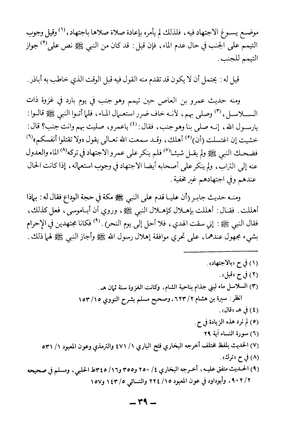 مَوْضِعٌ يَسُوغُ الِاجْتِهَادُ فِيهِ، فَلِذَلِكَ لَمْ يَأْمُرْهُ بِإِعَادَةِ صَلَاةٍ صَلَّاهَا بِاجْتِهَادٍ وَقِيلَ: وُجُوبُ التَّيَمُّمِ عَلَى الْجُنُبِ فِي حَالِ عَدَمِ الْمَاءِ،