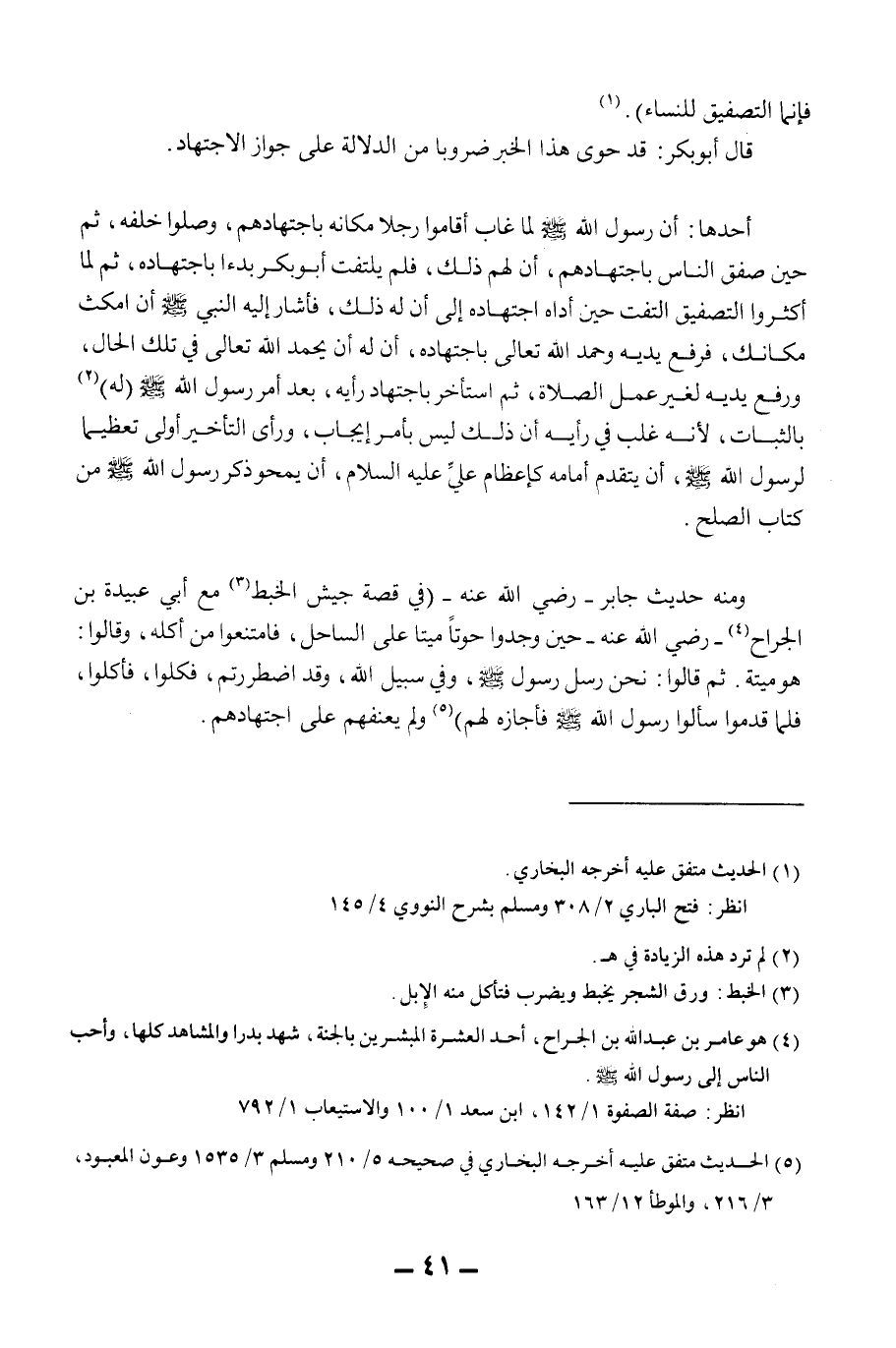 فَإِنَّمَا التَّصْفِيقُ لِلنِّسَاءِ» قَالَ أَبُو بَكْرٍ: قَدْ حَوَى هَذَا الْخَبَرُ ضُرُوبًا مِنْ الدَّلَالَةِ عَلَى جَوَازِ الِاجْتِهَادِ. أَحَدُهَا: أَنَّ رَسُولَ اللَّهِ - صَلَّى اللَّهُ عَلَيْهِ وَسَلَّمَ - لَمَّا غَابَ أَقَامُوا رَجُلًا مَكَانَهُ بِاجْتِهَادِهِمْ، وَصَلَّوْا خَلْفَهُ، ثُمَّ حِينَ صَفَّقَ النَّاسُ بِاجْتِهَادِهِمْ؛ أَنَّ لَهُمْ ذَلِكَ، فَلَمْ يَلْتَفِتْ أَبُو بَكْرٍ بَدْءًا بِاجْتِهَادِهِ، ثُمَّ لَمَّا أَكْثَرُوا التَّصْفِيقَ الْتَفَتَ حِينَ أَدَّاهُ اجْتِهَادُهُ إلَى أَنَّ لَهُ ذَلِكَ، فَأَشَارَ إلَيْهِ النَّبِيُّ - صَلَّى اللَّهُ عَلَيْهِ وَسَلَّمَ - أَنْ اُمْكُثْ مَكَانَك، فَرَفَعَ يَدَيْهِ وَحَمِدَ اللَّهَ تَعَالَى بِاجْتِهَادِهِ؛ أَنَّ لَهُ أَنْ يَحْمَدَ اللَّهَ تَعَالَى فِي تِلْكَ الْحَالِ، وَرَفَعَ يَدَيْهِ لِغَيْرِ عَمَلِ الصَّلَاةِ، ثُمَّ اسْتَأْخَرَ بِاجْتِهَادِ رَأْيِهِ، بَعْدَ أَمْرِ رَسُولِ اللَّهِ - صَلَّى اللَّهُ عَلَيْهِ وَسَلَّمَ - (لَهُ) بِالثَّبَاتِ، لِأَنَّهُ غَلَبَ فِي رَأْيِهِ أَنَّ ذَلِكَ لَيْسَ بِأَمْرِ إيجَابٍ، وَرَأَى التَّأْخِيرَ أَوْلَى تَعْظِيمًا لِرَسُولِ اللَّهِ - صَلَّى اللَّهُ عَلَيْهِ وَسَلَّمَ - أَنْ يَتَقَدَّمَ أَمَامَهُ كَإِعْظَامِ عَلِيٍّ - عَلَيْهِ السَّلَامُ - أَنْ يَمْحُوَ ذِكْرَ رَسُولَ اللَّهِ - صَلَّى اللَّهُ عَلَيْهِ وَسَلَّمَ - مِنْ كِتَابِ الصُّلْحِ.