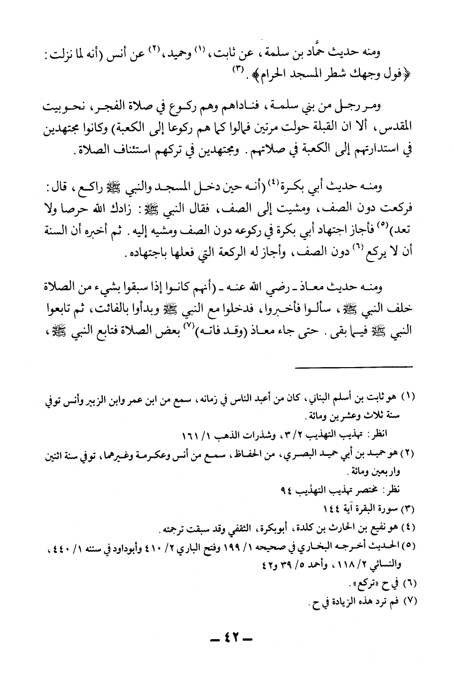 وَمِنْهُ حَدِيثُ حَمَّادِ بْنِ سَلَمَةَ، عَنْ ثَابِتٍ، وَحُمَيْدٍ، عَنْ أَنَسٍ أَنَّهُ «لَمَّا نَزَلَتْ: {فَوَلِّ وَجْهَكَ شَطْرَ الْمَسْجِدِ الْحَرَامِ} [البقرة: 144] وَمَرَّ رَجُلٌ مِنْ بَنِي سَلَمَةَ، فَنَادَاهُمْ وَهُمْ رُكُوعٌ فِي صَلَاةِ الْفَجْرِ، نَحْوَ بَيْتِ الْمَقْدِسِ: أَلَا إنَّ الْقِبْلَةَ حُوِّلَتْ. مَرَّتَيْنِ، فَمَالُوا كَمَا هُمْ رُكُوعًا إلَى الْكَعْبَةِ» وَكَانُوا مُجْتَهِدِينَ فِي اسْتِدَارَتِهِمْ إلَى الْكَعْبَةِ فِي صَلَاتِهِمْ. وَمُجْتَهِدِينَ فِي تَرْكِهِمْ اسْتِئْنَافَ الصَّلَاةِ.
