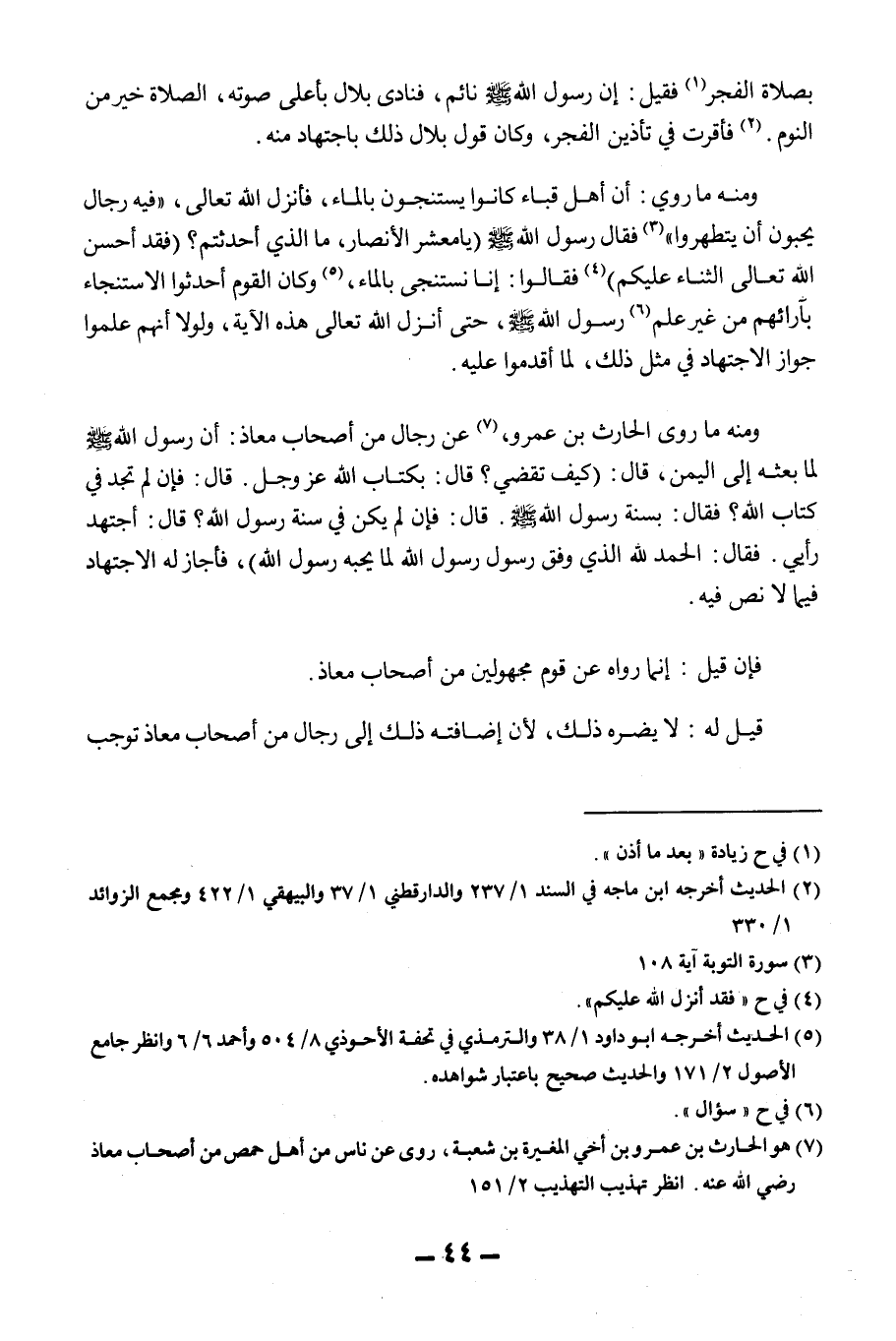 بِصَلَاةِ الْفَجْرِ فَقِيلَ: إنَّ رَسُولَ اللَّهِ - صَلَّى اللَّهُ عَلَيْهِ وَسَلَّمَ - نَائِمٌ، فَنَادَى بِلَالٌ بِأَعْلَى صَوْتِهِ: الصَّلَاةُ خَيْرٌ مِنْ النَّوْمِ.» فَأُقِرَّتْ فِي تَأْذِينِ الْفَجْرِ، وَكَانَ قَوْلُ بِلَالٍ ذَلِكَ بِاجْتِهَادٍ مِنْهُ. وَمِنْهُ مَا رُوِيَ: أَنَّ أَهْلَ قُبَاءَ كَانُوا يَسْتَنْجُونَ بِالْمَاءِ، فَأَنْزَلَ اللَّهُ تَعَالَى، {فِيهِ رِجَالٌ يُحِبُّونَ أَنْ يَتَطَهَّرُوا} [التوبة: 108] فَقَالَ رَسُولُ اللَّهِ - صَلَّى اللَّهُ عَلَيْهِ وَسَلَّمَ - «يَا مَعْشَرَ الْأَنْصَارِ، مَا الَّذِي أَحْدَثْتُمْ؟ فَقَدْ أَحْسَنَ اللَّهُ تَعَالَى الثَّنَاءَ عَلَيْكُمْ فَقَالُوا: إنَّا نَسْتَنْجِي بِالْمَاءِ» وَكَانَ الْقَوْمُ أَحْدَثُوا الِاسْتِنْجَاءَ بِآرَائِهِمْ مِنْ غَيْرِ عِلْمِ رَسُولِ اللَّهِ - صَلَّى اللَّهُ عَلَيْهِ وَسَلَّمَ - حَتَّى أَنْزَلَ اللَّهُ تَعَالَى هَذِهِ الْآيَةَ، وَلَوْلَا أَنَّهُمْ عَلِمُوا جَوَازَ الِاجْتِهَادِ فِي مِثْلِ ذَلِكَ، لَمَا أَقْدَمُوا عَلَيْهِ.