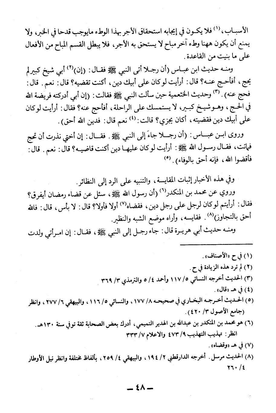 وَمِنْهُ حَدِيثُ ابْنِ عَبَّاسٍ «أَنَّ رَجُلًا أَتَى النَّبِيَّ - صَلَّى اللَّهُ عَلَيْهِ وَسَلَّمَ - فَقَالَ: إنَّ أَبِي شَيْخٌ كَبِيرٌ لَمْ يَحُجَّ، أَفَأَحُجُّ عَنْهُ؟ قَالَ: أَرَأَيْتَ لَوْ كَانَ عَلَى أَبِيكَ دَيْنٌ، أَكُنْتَ تَقْضِيهِ؟ قَالَ: نَعَمْ. قَالَ: فَحُجَّ عَنْهُ وَحَدِيثُ الْخَثْعَمِيَّةِ حِينَ سَأَلَتْ النَّبِيَّ - صَلَّى اللَّهُ عَلَيْهِ وَسَلَّمَ - فَقَالَتْ: إنَّ أَبِي أَدْرَكَتْهُ فَرِيضَةُ اللَّهِ فِي الْحَجِّ، وَهُوَ شَيْخٌ كَبِيرٌ، لَا يَسْتَمْسِكُ عَلَى الرَّاحِلَةِ، أَفَأَحُجُّ عَنْهُ؟ فَقَالَ: أَرَأَيْتِ لَوْ كَانَ عَلَى أَبِيكِ دَيْنٌ فَقَضَيْتِهِ، أَكَانَ يَجْزِي؟ قَالَتْ: نَعَمْ قَالَ: فَدَيْنُ اللَّهِ أَحَقُّ وَرَوَى ابْنُ عَبَّاسٍ: أَنَّ رَجُلًا جَاءَ إلَى النَّبِيِّ - صَلَّى اللَّهُ عَلَيْهِ وَسَلَّمَ -. فَقَالَ: إنْ أُخْتِي نَذَرَتْ أَنْ تَحُجَّ فَمَاتَتْ، فَقَالَ رَسُولُ اللَّهِ - صَلَّى اللَّهُ عَلَيْهِ وَسَلَّمَ -: أَرَأَيْتَ لَوْ كَانَ عَلَيْهَا دَيْنٌ أَكُنْتَ قَاضِيَهُ؟ قَالَ: نَعَمْ. قَالَ: فَاقْضُوا اللَّهَ، فَإِنَّهُ أَحَقُّ بِالْوَفَاءِ» . وَفِي هَذِهِ الْأَخْبَارِ إثْبَاتُ الْمُقَايَسَةِ، وَالتَّنْبِيهُ عَلَى الرَّدِّ إلَى النَّظَائِرِ.