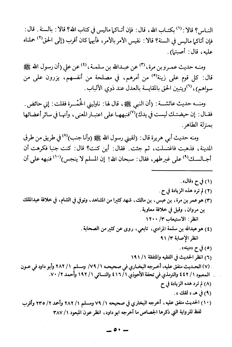 وَمِنْهُ حَدِيثُ عَمْرِو بْنِ مُرَّةَ، عَنْ عَبْدِ اللَّهِ بْنِ سَلَمَةَ، عَنْ عَلِيٍّ «أَنَّ رَسُولَ اللَّهِ - صَلَّى اللَّهُ عَلَيْهِ وَسَلَّمَ - قَالَ: كُلُّ قَوْمٍ عَلَى بَيِّنَةٍ مِنْ أَمْرِهِمْ، فِي مَصْلَحَةٍ مِنْ أَنْفُسِهِمْ، يَزِرُونَ عَلَى مَنْ سِوَاهُمْ» ، وَيَتَبَيَّنُ الْحَقُّ بِالْمُقَايَسَةِ بِالْعَدْلِ عِنْدَ ذَوِي الْأَلْبَابِ. وَمِنْهُ حَدِيثُ «عَائِشَةَ: أَنَّ النَّبِيَّ - صَلَّى اللَّهُ عَلَيْهِ وَسَلَّمَ -، قَالَ لَهَا: نَاوِلِينِي الْخُمْرَةَ فَقُلْتُ: إنِّي حَائِضٌ. فَقَالَ: إنْ حَيْضَتَكِ لَيْسَتْ فِي يَدِكِ» فَنَبَّهَهَا عَلَى اعْتِبَارِ الْمَعْنَى، وَأَنَّهَا فِي سَائِرِ أَعْضَائِهَا بِمَنْزِلَةِ الطَّاهِرِ. وَمِنْهُ حَدِيثُ «أَبِي هُرَيْرَةَ قَالَ: لَقِيَنِي رَسُولُ اللَّهِ - صَلَّى اللَّهُ عَلَيْهِ وَسَلَّمَ - وَأَنَا جُنُبٌ فِي طَرِيقٍ مِنْ طُرُقِ الْمَدِينَةِ، فَذَهَبْت فَاغْتَسَلْت، ثُمَّ جِئْت. فَقَالَ: أَيْنَ كُنْتَ؟ قَالَ: كُنْتُ جُنُبًا فَكَرِهْتُ أَنْ أُجَالِسَكَ عَلَى غَيْرِ طُهْرٍ، فَقَالَ: سُبْحَانَ اللَّهِ إنَّ الْمُسْلِمَ لَا يَنْجُسُ» فَنَبَّهَهُ عَلَى أَنَّ