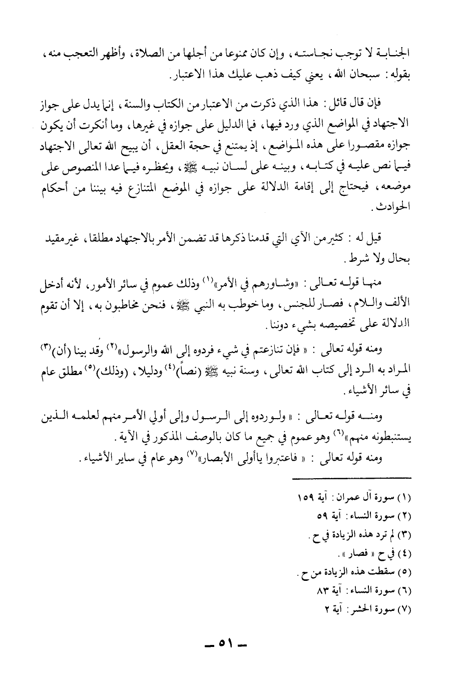 قِيلَ لَهُ: كَثِيرٌ مِنْ الْآيِ الَّتِي قَدَّمْنَا ذِكْرَهَا قَدْ تَضَمَّنَ الْأَمْرَ بِالِاجْتِهَادِ مُطْلَقًا، غَيْرَ مُقَيَّدٍ بِحَالٍ وَلَا شَرْطٍ. مِنْهَا قَوْله تَعَالَى: {وَشَاوِرْهُمْ فِي الْأَمْرِ} [آل عمران: 159] وَذَلِكَ عُمُومٌ فِي سَائِرِ الْأُمُورِ، لِأَنَّهُ أَدْخَلَ الْأَلِفَ وَاللَّامَ، فَصَارَ لِلْجِنْسِ، وَمَا خُوطِبَ بِهِ النَّبِيُّ - صَلَّى اللَّهُ عَلَيْهِ وَسَلَّمَ - فَنَحْنُ مُخَاطَبُونَ بِهِ، إلَّا أَنْ تَقُومَ الدَّلَالَةُ عَلَى تَخْصِيصِهِ بِشَيْءٍ دُونَنَا.