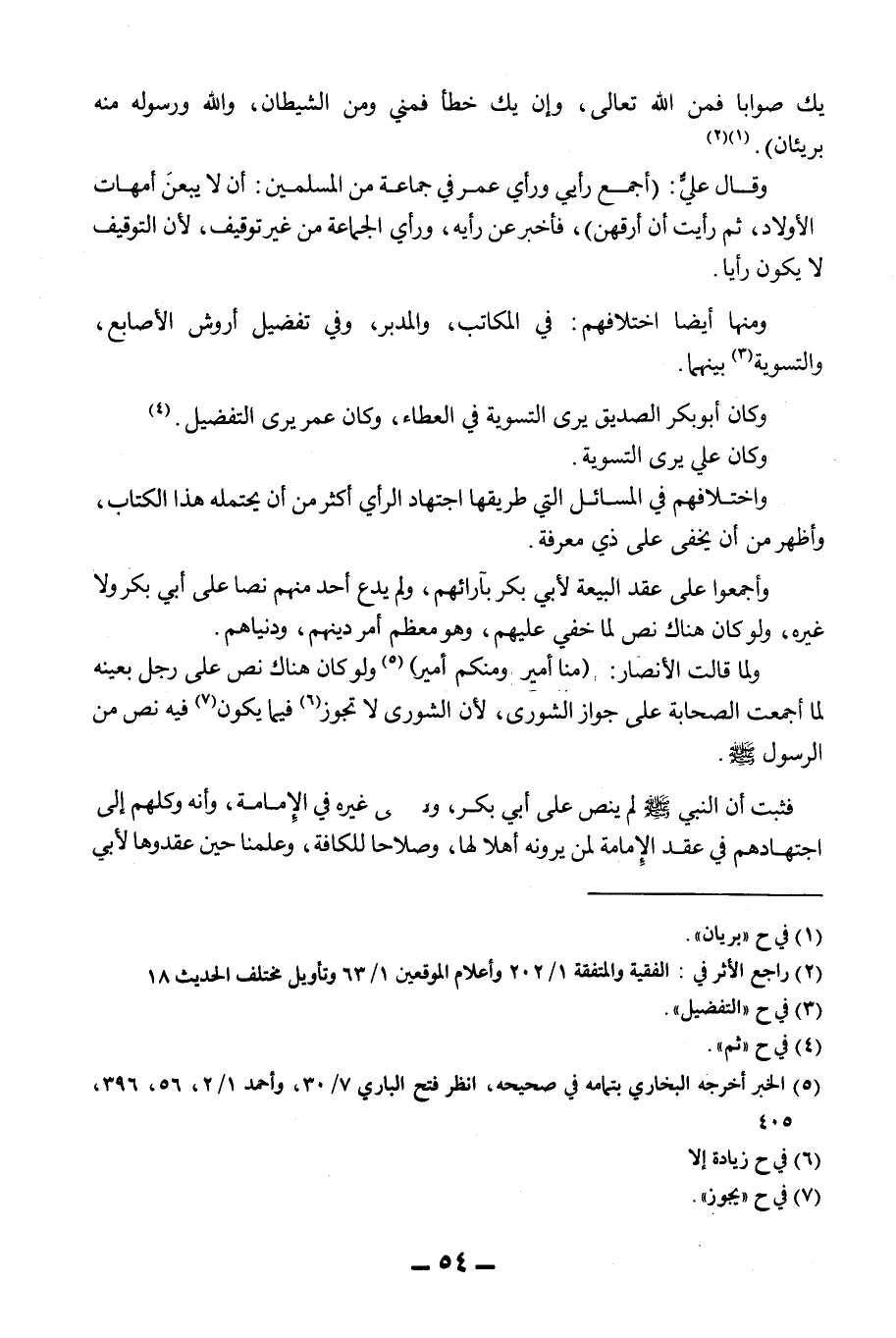 وَمِنْهَا أَيْضًا اخْتِلَافُهُمْ: فِي الْمُكَاتَبِ، وَالْمُدَبَّرِ، وَفِي تَفْضِيلِ أُرُوشِ الْأَصَابِعِ، وَالتَّسْوِيَةِ بَيْنَهُمَا. وَكَانَ أَبُو بَكْرٍ الصِّدِّيقُ يَرَى التَّسْوِيَةَ فِي الْعَطَاءِ، وَكَانَ عُمَرُ يَرَى التَّفْضِيلَ. وَكَانَ عَلِيٌّ يَرَى التَّسْوِيَةَ. وَاخْتِلَافُهُمْ فِي الْمَسَائِلِ الَّتِي طَرِيقُهَا اجْتِهَادُ الرَّأْيِ أَكْثَرُ مِنْ أَنْ يَحْتَمِلَهُ هَذَا الْكِتَابُ، وَأَظْهَرُ مِنْ أَنْ يَخْفَى عَلَى ذِي مَعْرِفَةٍ. وَأَجْمَعُوا عَلَى عَقْدِ الْبَيْعَةِ لِأَبِي بَكْرٍ بِآرَائِهِمْ، وَلَمْ يَدَّعِ أَحَدٌ مِنْهُمْ نَصًّا عَلَى أَبِي بَكْرٍ وَلَا غَيْرِهِ، وَلَوْ كَانَ هُنَاكَ نَصٌّ لَمَا خَفِيَ عَلَيْهِمْ، وَهُوَ مُعْظَمُ أَمْرِ دِينِهِمْ، وَدُنْيَاهُمْ. وَلَمَّا قَالَتْ الْأَنْصَارُ: (مِنَّا أَمِيرٌ وَمِنْكُمْ أَمِيرٌ) وَلَوْ كَانَ هُنَاكَ نَصٌّ عَلَى رَجُلٍ بِعَيْنِهِ لَمَا أَجْمَعَتْ الصَّحَابَةُ عَلَى جَوَازِ الشُّورَى، لِأَنَّ الشُّورَى لَا تَجُوزُ فِيمَا يَكُونُ فِيهِ نَصٌّ مِنْ الرَّسُولِ - صَلَّى اللَّهُ عَلَيْهِ وَسَلَّمَ -.