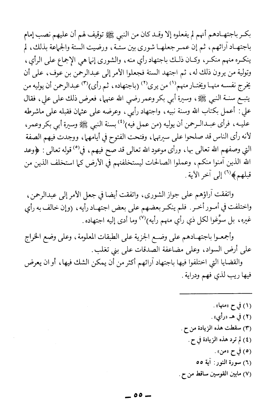وَاتَّفَقَتْ آرَاؤُهُمْ عَلَى جَوَازِ الشُّورَى، وَاتَّفَقَتْ أَيْضًا فِي جَعْلِ الْأَمْرِ إلَى عَبْدِ الرَّحْمَنِ، وَاخْتَلَفَتْ فِي أُمُورٍ أُخَرَ. فَلَمْ يُنْكِرْ بَعْضُهُمْ عَلَى بَعْضٍ اجْتِهَادَ رَأْيِهِ، (وَإِنْ خَالَفَ بِهِ رَأْيَ غَيْرِهِ، بَلْ سَوَّغُوا لِكُلِّ ذِي رَأْيٍ مِنْهُمْ رَأْيَهُ) وَمَا أَدَّى إلَيْهِ اجْتِهَادُهُ. وَأَجْمَعُوا بِاجْتِهَادِهِمْ عَلَى وَضْعِ الْجِزْيَةِ عَلَى الطَّبَقَاتِ الْمَعْلُومَةِ، وَعَلَى وَضْعِ الْخَرَاجِ عَلَى أَرْضِ السَّوَادِ، وَعَلَى مُضَاعَفَةِ الصَّدَقَاتِ عَلَى بَنِي تَغْلِبَ. وَالْقَضَايَا الَّتِي اخْتَلَفُوا فِيهَا بِاجْتِهَادِ آرَائِهِمْ أَكْثَرُ مِنْ أَنْ يُمْكِنَ الشَّكُّ فِيهَا، أَوْ أَنْ يَعْرِضَ فِيهَا رَيْبٌ لِذِي فَهْمٍ وَدِرَايَةٍ.