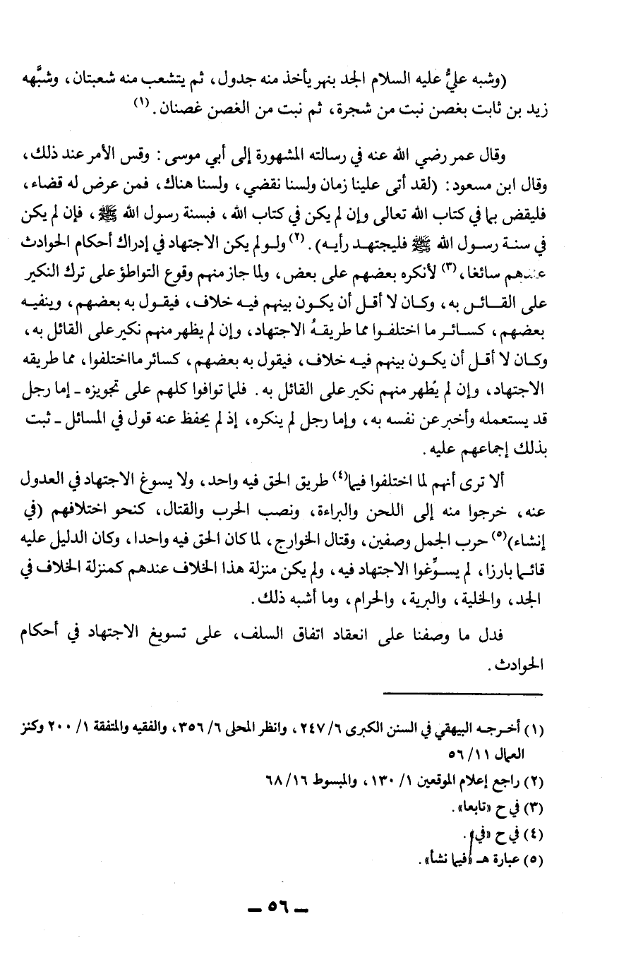 أَلَا تَرَى أَنَّهُمْ لَمَّا اخْتَلَفُوا فِيمَا طَرِيقُ الْحَقِّ فِيهِ وَاحِدٌ، وَلَا يَسُوغُ الِاجْتِهَادُ فِي الْعُدُولِ عَنْهُ، خَرَجُوا مِنْهُ إلَى اللَّحْنِ وَالْبَرَاءَةِ، وَنَصْبِ الْحَرْبِ وَالْقِتَالِ، كَنَحْوِ اخْتِلَافِهِمْ (فِي إنْشَاءِ) حَرْبِ الْجَمَلِ وَصِفِّينَ، وَقِتَالِ الْخَوَارِجِ، لَمَّا كَانَ الْحَقُّ فِيهِ وَاحِدًا، وَكَانَ الدَّلِيلُ عَلَيْهِ قَائِمًا بَارِزًا، لَمْ يُسَوِّغُوا الِاجْتِهَادَ فِيهِ، وَلَمْ يَكُنْ مَنْزِلَةُ هَذَا الْخِلَافِ عِنْدَهُمْ كَمَنْزِلَةِ الْخِلَافِ فِي الْجَدِّ، وَالْخَلِيَّةِ، وَالْبَرِيَّةِ، وَالْحَرَامِ، وَمَا أَشْبَهَ ذَلِكَ. فَدَلَّ مَا وَصَفْنَا عَلَى انْعِقَادِ اتِّفَاقِ السَّلَفِ، عَلَى تَسْوِيغِ الِاجْتِهَادِ فِي أَحْكَامِ الْحَوَادِثِ