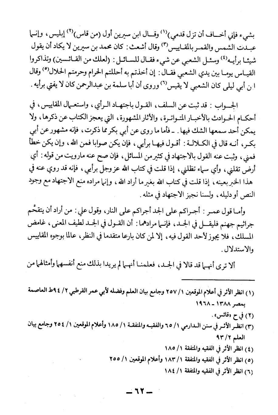 وَقَالَ ابْنُ سِيرِينَ: أَوَّلُ (مَنْ قَاسَ) إبْلِيسُ، وَإِنَّمَا عُبِدَتْ الشَّمْسُ وَالْقَمَرُ بِالْمَقَايِيسِ وَقَالَ أَشْعَثُ: كَانَ مُحَمَّدُ بْنُ سِيرِينَ لَا يَكَادُ أَنْ يَقُولَ شَيْئًا بِرَأْيِهِ وَسُئِلَ الشَّعْبِيُّ عَنْ شَيْءٍ فَقَالَ لِلسَّائِلِ: (لَعَلَّك مِنْ الْقَائِسِينَ) وَتَذَاكَرُوا الْقِيَاسَ يَوْمًا بَيْنَ يَدَيْ الشَّعْبِيِّ فَقَالَ: إنْ أَخَذْتُمْ بِهِ أَحْلَلْتُمْ الْحَرَامَ وَحَرَّمْتُمْ الْحَلَالَ وَقَالَ ابْنُ أَبِي لَيْلَى كَانَ الشَّعْبِيُّ لَا يَقِيسُ وَرُوِيَ أَنَّ أَبَا سَلَمَةَ بْنَ عَبْدِ الرَّحْمَنِ كَانَ لَا يُفْتِي بِرَأْيِهِ.