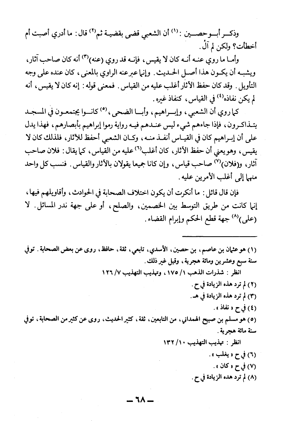 وَذَكَرَ أَبُو حُصَيْنٍ: أَنَّ الشَّعْبِيَّ قَضَى بِقَضِيَّةٍ ثُمَّ قَالَ: مَا أَدْرِي أَصَبْتُ أَمْ أَخْطَأْتُ؟ وَلَكِنْ لَمْ آلُ. وَأَمَّا مَا رُوِيَ عَنْهُ أَنَّهُ كَانَ لَا يَقِيسُ، فَإِنَّهُ قَدْ رُوِيَ (عَنْهُ) أَنَّهُ كَانَ صَاحِبَ آثَارٍ، وَيُشْبِهُ أَنْ يَكُونَ هَذَا أَصْلَ الْحَدِيثِ. وَإِنَّمَا عَبَّرَ عَنْهُ الرَّاوِي بِالْمَعْنَى، كَانَ عِنْدَهُ عَلَى وَجْهِ التَّأْوِيلِ. وَقَدْ كَانَ حِفْظُ الْآثَارِ أَغْلَبَ عَلَيْهِ مِنْ الْقِيَاسِ. فَمَعْنَى قَوْلِهِ: إنَّهُ كَانَ لَا يَقِيسُ، أَنَّهُ لَمْ يَكُنْ نَفَاذُهُ فِي الْقِيَاسِ، كَنَفَاذِ غَيْرِهِ. كَمَا رُوِيَ أَنَّ الشَّعْبِيَّ، وَإِبْرَاهِيمَ، وَأَبَا الضُّحَى، كَانُوا يَجْتَمِعُونَ فِي الْمَسْجِدِ يَتَذَاكَرُونَ، فَإِذَا جَاءَهُمْ شَيْءٌ لَيْسَ عِنْدَهُمْ فِيهِ رِوَايَةٌ رَمَوْا إبْرَاهِيمَ بِأَبْصَارِهِمْ، فَهَذَا يَدُلُّ عَلَى أَنَّ إبْرَاهِيمَ كَانَ فِي الْقِيَاسِ أَنْفَذَ مِنْهُ، وَكَانَ الشَّعْبِيُّ أَحْفَظَ لِلْآثَارِ، فَلِذَلِكَ كَانَ لَا يَقِيسُ، وَهُوَ يَعْنِي أَنَّ حِفْظَ الْآثَارِ، كَانَ أَغْلَبَ عَلَيْهِ مِنْ الْقِيَاسِ، كَمَا يُقَالُ: فُلَانٌ صَاحِبُ آثَارٍ، وَ (فُلَانٌ) صَاحِبُ قِيَاسٍ، وَإِنْ كَانَا جَمِيعًا يَقُولَانِ بِالْآثَارِ وَالْقِيَاسِ. فَنُسِبَ كُلُّ وَاحِدٍ مِنْهُمَا إلَى أَغْلَبِ الْأَمْرَيْنِ عَلَيْهِ.