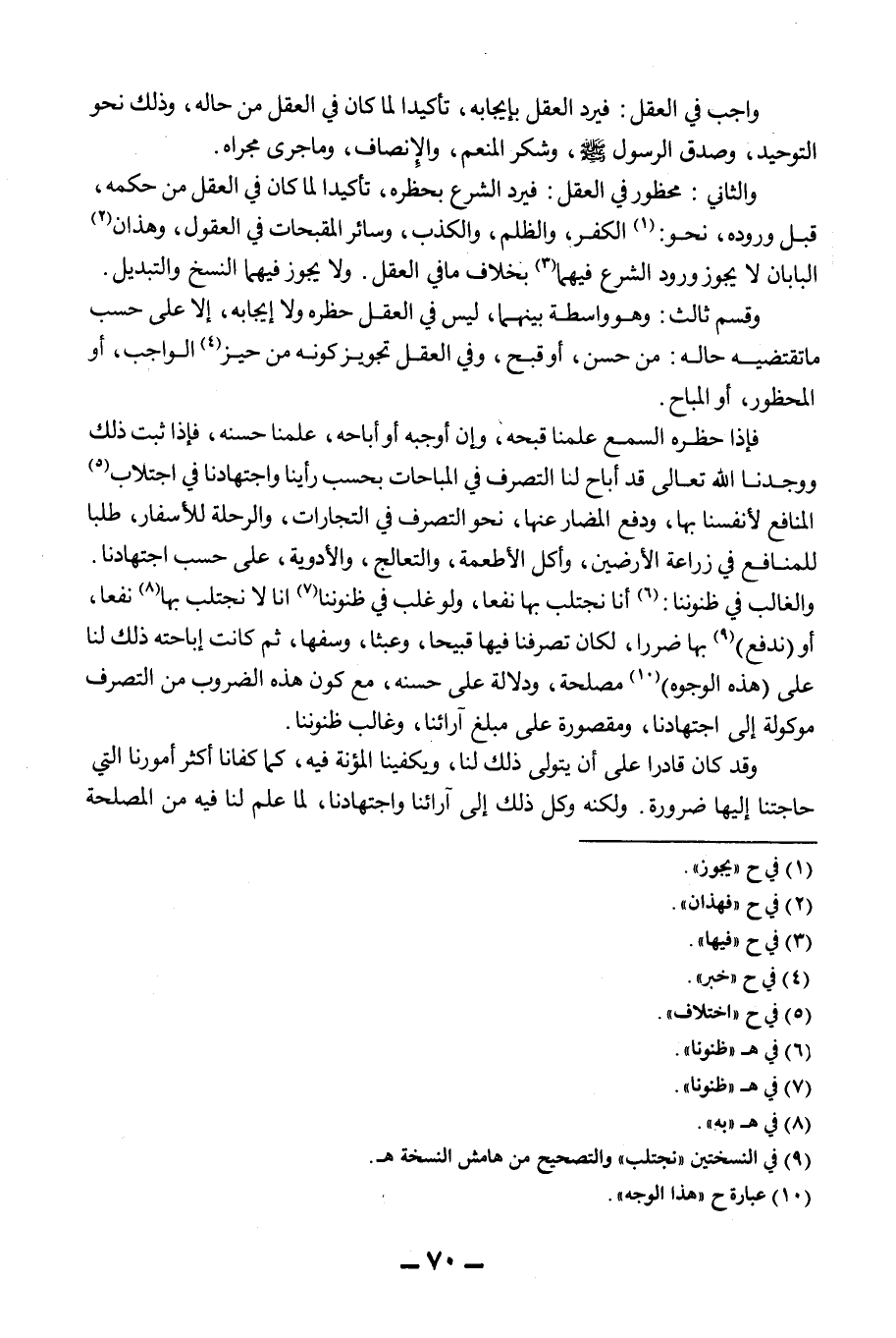 وَالثَّانِي: مَحْظُورٌ فِي الْعَقْلِ: فَيَرِدُ الشَّرْعُ بِحَظْرِهِ، تَأْكِيدًا لِمَا كَانَ فِي الْعَقْلِ مِنْ حُكْمِهِ، قَبْلَ وُرُودِهِ، نَحْوُ: الْكُفْرِ، وَالظُّلْمِ، وَالْكَذِبِ، وَسَائِرِ الْمُقَبَّحَاتِ فِي الْعُقُولِ، وَهَذَانِ الْبَابَانِ لَا يَجُوزُ وُرُودُ الشَّرْعِ فِيهِمَا خِلَافَ مَا فِي الْعَقْلِ. وَلَا يَجُوزُ فِيهِمَا النَّسْخُ وَالتَّبْدِيلُ. وَقِسْمٌ ثَالِثٌ: وَهُوَ وَاسِطَةٌ بَيْنَهُمَا، لَيْسَ فِي الْعَقْلِ حَظْرُهُ وَلَا إيجَابُهُ، إلَّا عَلَى حَسَبِ مَا تَقْتَضِيهِ حَالُهُ: مِنْ حُسْنٍ، أَوْ قُبْحٍ، وَفِي الْعَقْلِ تَجْوِيزُ كَوْنِهِ مِنْ حَيِّزِ الْوَاجِبِ، أَوْ الْمَحْظُورِ، أَوْ الْمُبَاحِ. فَإِذَا حَظَرَهُ السَّمْعُ عَلِمْنَا قُبْحَهُ، وَإِنْ أَوْجَبَهُ أَوْ أَبَاحَهُ، عَلِمْنَا حُسْنَهُ، فَإِذَا ثَبَتَ ذَلِكَ وَوَجَدْنَا اللَّهَ تَعَالَى قَدْ أَبَاحَ لَنَا التَّصَرُّفَ فِي الْمُبَاحَاتِ بِحَسَبِ رَأْيِنَا وَاجْتِهَادِنَا فِي اجْتِلَابِ الْمَنَافِعِ لِأَنْفُسِنَا بِهَا، وَدَفْعِ الْمَضَارِّ عَنْهَا، نَحْوُ التَّصَرُّفِ فِي التِّجَارَاتِ، وَالرِّحْلَةِ لِلْأَسْفَارِ، طَلَبًا لِلْمَنَافِعِ فِي زِرَاعَةِ الْأَرَضِينَ، وَأَكْلِ الْأَطْعِمَةِ، وَالتَّعَالُجِ، وَالْأَدْوِيَةِ، عَلَى حَسَبِ اجْتِهَادِنَا.