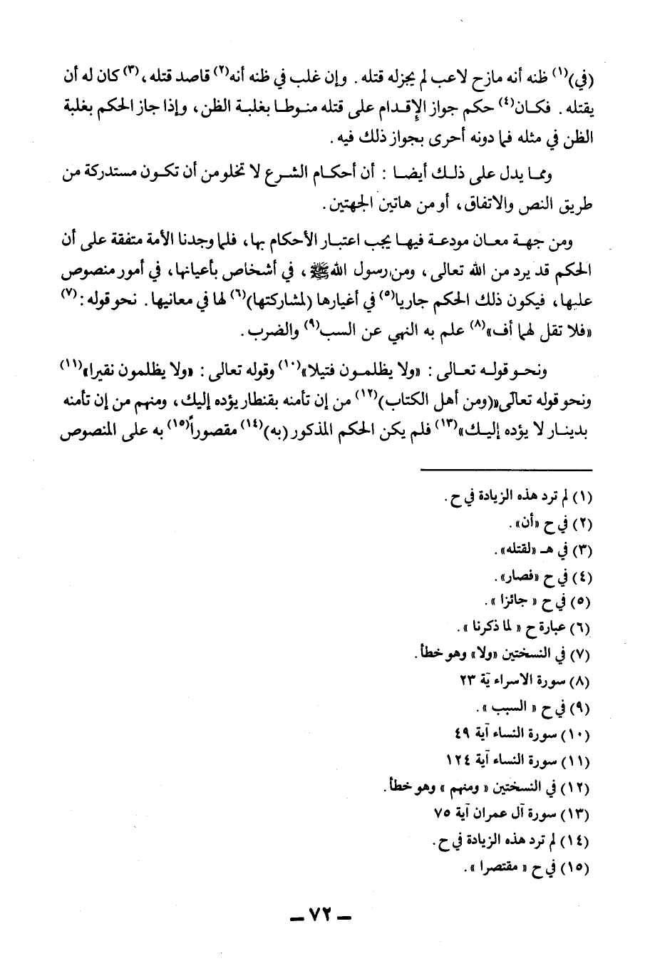 فِي) ظَنِّهِ أَنَّهُ مَازِحٌ لَاعِبٌ لَمْ يَجُزْ لَهُ قَتْلُهُ. وَإِنْ غَلَبَ فِي ظَنِّهِ أَنَّهُ قَاصِدٌ قَتْلَهُ، كَانَ لَهُ أَنْ يَقْتُلَهُ. فَكَانَ حُكْمُ جَوَازِ الْإِقْدَامِ عَلَى قَتْلِهِ مَنُوطًا بِغَلَبَةِ الظَّنِّ، وَإِذَا جَازَ الْحُكْمُ بِغَلَبَةِ الظَّنِّ فِي مِثْلِهِ فَمَا دُونَهُ أَحْرَى بِجَوَازِ ذَلِكَ فِيهِ. وَمِمَّا يَدُلُّ عَلَى ذَلِكَ أَيْضًا: أَنَّ أَحْكَامَ الشَّرْعِ لَا تَخْلُو مِنْ أَنْ تَكُونَ مُسْتَدْرَكَةً مِنْ طَرِيقِ النَّصِّ وَالِاتِّفَاقِ، أَوْ مِنْ هَاتَيْنِ الْجِهَتَيْنِ.