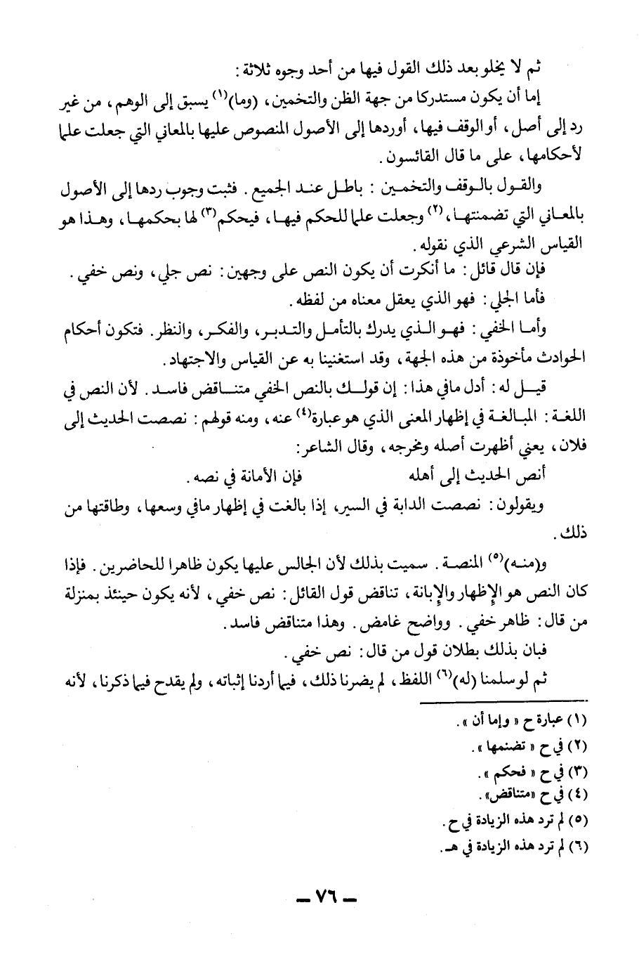 وَيَقُولُونَ: نَصَصَتْ الدَّابَّةُ فِي السَّيْرِ، إذَا بَالَغَتْ فِي إظْهَارِ مَا فِي وُسْعِهَا، وَطَاقَتِهَا مِنْ ذَلِكَ. وَ (مِنْهُ) الْمِنَصَّةُ. سُمِّيَتْ بِذَلِكَ لِأَنَّ الْجَالِسَ عَلَيْهَا يَكُونُ ظَاهِرًا لِلْحَاضِرِينَ. فَإِذَا كَانَ النَّصُّ هُوَ الْإِظْهَارَ وَالْإِبَانَةَ، تَنَاقَضَ قَوْلُ الْقَائِلِ: نَصٌّ خَفِيٌّ، لِأَنَّهُ يَكُونُ حِينَئِذٍ بِمَنْزِلَةِ مَنْ قَالَ: ظَاهِرٌ خَفِيٌّ. وَوَاضِحٌ غَامِضٌ. وَهَذَا مُتَنَاقِضٌ فَاسِدٌ. فَبَانَ بِذَلِكَ بُطْلَانُ قَوْلِ مَنْ قَالَ: نَصٌّ خَفِيٌّ. ثُمَّ لَوْ سَلَّمْنَا (لَهُ) اللَّفْظَ، لَمْ يَضُرَّنَا ذَلِكَ، فِيمَا أَرَدْنَا إثْبَاتَهُ، وَلَمْ يَقْدَحْ فِيمَا ذَكَرْنَا، لِأَنَّهُ