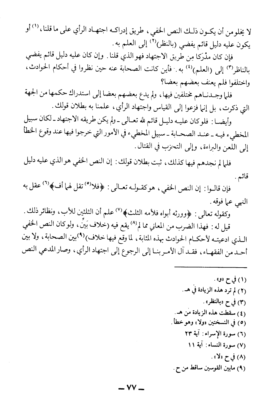 لَا يَخْلُو مِنْ أَنْ يَكُونَ ذَلِكَ النَّصُّ الْخَفِيُّ، طَرِيقَ إدْرَاكِهِ اجْتِهَادَ الرَّأْيِ عَلَى مَا قُلْنَا، أَوْ يَكُونَ عَلَيْهِ دَلِيلٌ قَائِمٌ يُفْضِي (بِالنَّظَرِ) إلَى الْعِلْمِ بِهِ. فَإِنْ كَانَ مُدْرَكًا مِنْ طَرِيقِ الِاجْتِهَادِ فَهُوَ الَّذِي قُلْنَا. وَإِنْ كَانَ عَلَيْهِ دَلِيلٌ قَائِمٌ يُفْضِي بِالنَّاظِرِ إلَى (الْعِلْمِ) بِهِ. فَأَيْنَ كَانَتْ الصَّحَابَةُ عَنْهُ حِينَ نَظَرُوا فِي أَحْكَامِ الْحَوَادِثِ، وَاخْتَلَفُوا فَلَمْ يُعَنِّفْ بَعْضُهُمْ بَعْضًا؟ فَلَمَّا وَجَدْنَاهُمْ مُخْتَلِفِينَ فِيهَا، وَلَمْ يَدْعُ بَعْضُهُمْ بَعْضًا إلَى اسْتِدْرَاكِ حُكْمِهَا مِنْ الْجِهَةِ الَّتِي ذُكِرَتْ، بَلْ إنَّمَا فَزِعُوا إلَى الْقِيَاسِ وَاجْتِهَادِ الرَّأْيِ، عَلِمْنَا بِهِ بُطْلَانَ قَوْلِكَ.