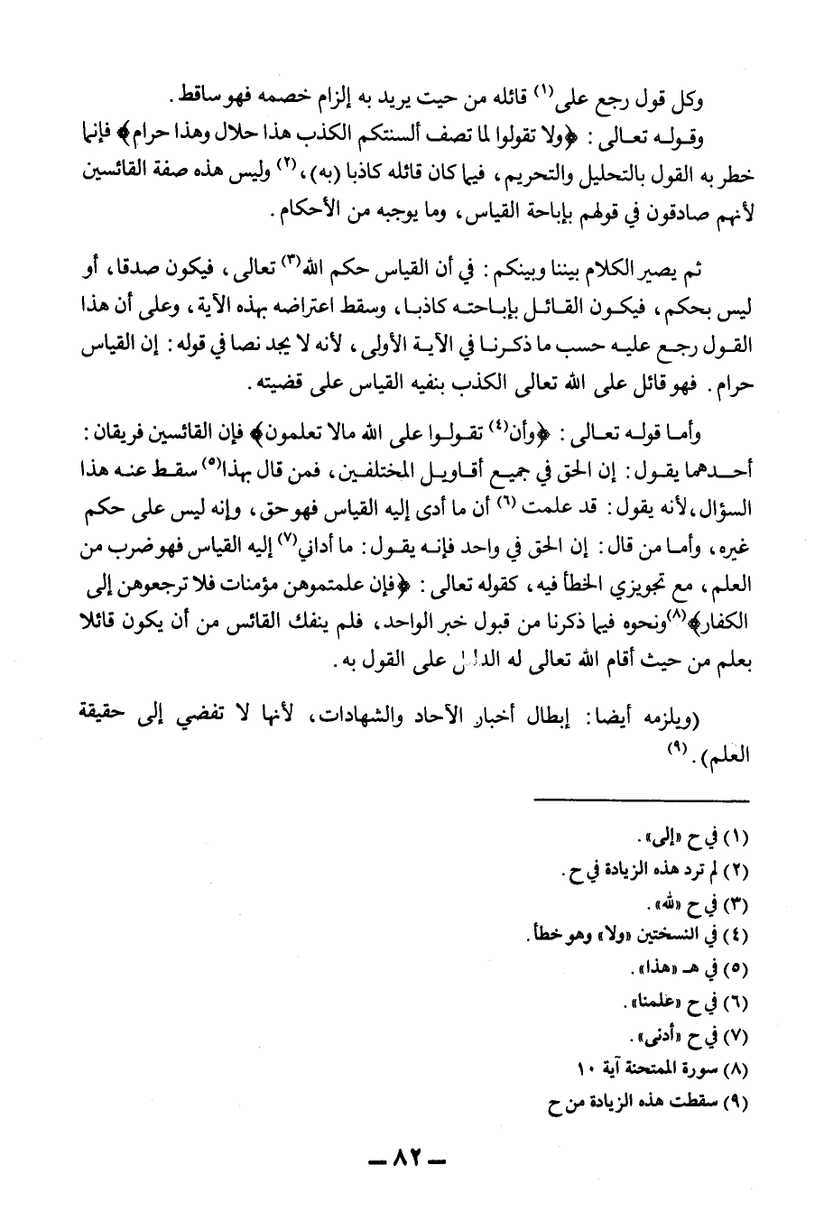 وَكُلُّ قَوْلٍ رَجَعَ عَلَى قَائِلِهِ مِنْ حَيْثُ يُرِيدُ بِهِ إلْزَامَ خَصْمِهِ فَهُوَ سَاقِطٌ. وقَوْله تَعَالَى: {وَلَا تَقُولُوا لِمَا تَصِفُ أَلْسِنَتُكُمْ الْكَذِبَ هَذَا حَلَالٌ وَهَذَا حَرَامٌ} [النحل: 116] فَإِنَّمَا خَطَرَ بِهِ الْقَوْلُ بِالتَّحْلِيلِ وَالتَّحْرِيمِ، فِيمَا كَانَ قَائِلُهُ كَاذِبًا (بِهِ) ، وَلَيْسَ هَذِهِ صِفَةَ الْقَائِسِينَ؛ لِأَنَّهُمْ صَادِقُونَ فِي قَوْلِهِمْ بِإِبَاحَةِ الْقِيَاسِ، وَمَا يُوجِبُهُ مِنْ الْأَحْكَامِ. ثُمَّ يَصِيرُ الْكَلَامُ بَيْنَنَا وَبَيْنَكُمْ: فِي أَنَّ الْقِيَاسَ حُكْمُ اللَّهِ تَعَالَى، فَيَكُونُ صَادِقًا، أَوْ لَيْسَ بِحُكْمٍ، فَيَكُونُ الْقَائِلُ بِإِبَاحَتِهِ كَاذِبًا، وَسَقَطَ اعْتِرَاضُهُ بِهَذِهِ الْآيَةِ، وَعَلَى أَنَّ هَذَا الْقَوْلَ رَجَعَ عَلَيْهِ حَسْبَ مَا ذَكَرْنَا فِي الْآيَةِ الْأُولَى،؛ لِأَنَّهُ لَا يَجِدُ نَصًّا فِي قَوْلِهِ: إنَّ الْقِيَاسَ حَرَامٌ. فَهُوَ قَائِلٌ عَلَى اللَّهِ تَعَالَى الْكَذِبَ بِنَفْيِهِ الْقِيَاسَ عَلَى قَضِيَّتِهِ. وَأَمَّا قَوْله تَعَالَى: {وَأَنْ تَقُولُوا عَلَى اللَّهِ مَا لَا تَعْلَمُونَ} [البقرة: 169] فَإِنَّ الْقَائِسِينَ فَرِيقَانِ: أَحَدُهُمَا يَقُولُ: إنَّ الْحَقَّ فِي جَمِيعِ أَقَاوِيلِ الْمُخْتَلِفِينَ، فَمَنْ قَالَ بِهَذَا سَقَطَ عَنْهُ هَذَا السُّؤَالُ،؛ لِأَنَّهُ يَقُولُ: قَدْ عَلِمْت أَنَّ مَا أَدَّى إلَيْهِ الْقِيَاسُ فَهُوَ حَقٌّ، وَأَنَّهُ لَيْسَ عَلَى حُكْمِ غَيْرِهِ، وَأَمَّا مَنْ قَالَ: إنَّ الْحَقَّ فِي وَاحِدٍ فَإِنَّهُ يَقُولُ: مَا أَدَّانِي إلَيْهِ الْقِيَاسُ فَهُوَ ضَرْبٌ مِنْ الْعِلْمِ، مَعَ تَجْوِيزِي الْخَطَأَ فِيهِ، كَقَوْلِهِ تَعَالَى: {فَإِنْ عَلِمْتُمُوهُنَّ مُؤْمِنَاتٍ فَلَا تَرْجِعُوهُنَّ إلَى الْكُفَّارِ} [الممتحنة: 10] وَنَحْوِهِ فِيمَا ذَكَرْنَا مِنْ قَبُولِ خَبَرِ الْوَاحِدِ، فَلَمْ يَنْفَكَّ الْقَائِسُ مِنْ أَنْ يَكُونَ قَائِلًا بِعِلْمٍ مِنْ حَيْثُ أَقَامَ اللَّهُ تَعَالَى لَهُ الدَّلِيلَ عَلَى الْقَوْلِ بِهِ.