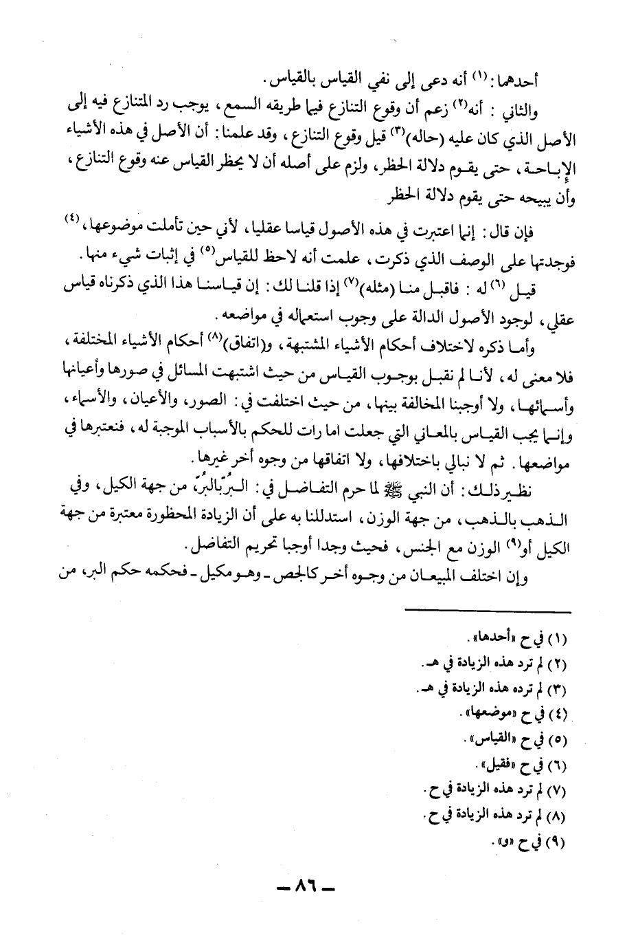 وَالثَّانِي: أَنَّهُ زَعَمَ أَنَّ وُقُوعَ التَّنَازُعِ فِيمَا طَرِيقُهُ السَّمْعُ، يُوجِبُ رَدَّ الْمُتَنَازَعِ فِيهِ إلَى الْأَصْلِ الَّذِي كَانَ عَلَيْهِ (حَالُهُ) قَبْلَ وُقُوعِ التَّنَازُعِ، وَقَدْ عَلِمْنَا: أَنَّ الْأَصْلَ فِي هَذِهِ الْأَشْيَاءِ الْإِبَاحَةُ، حَتَّى يَقُومَ دَلَالَةُ الْحَظْرِ، وَلَزِمَ عَلَى أَصْلِهِ أَنْ لَا يَحْظُرَ الْقِيَاسُ عَنْهُ وُقُوعَ التَّنَازُعِ، وَأَنْ يُبِيحَهُ حَتَّى يَقُومَ دَلَالَةُ الْحَظْرِ فَإِنْ قَالَ: إنَّمَا اعْتَبَرْت فِي هَذِهِ الْأُصُولِ قِيَاسًا عَقْلِيًّا، لِأَنِّي حِينَ تَأَمَّلْتُ مَوْضُوعَهَا، فَوَجَدْتهَا عَلَى الْوَصْفِ الَّذِي ذَكَرْت، عَلِمْت أَنَّهُ لَا حَظَّ لِلْقِيَاسِ فِي إثْبَاتِ شَيْءٍ مِنْهَا. قِيلَ لَهُ: فَاقْبَلْ مِنَّا (مِثْلَهُ) إذَا قُلْنَا لَك: إنَّ قِيَاسَنَا هَذَا الَّذِي ذَكَرْنَاهُ قِيَاسٌ عَقْلِيٌّ، لِوُجُودِ الْأُصُولِ الدَّالَّةِ عَلَى وُجُوبِ اسْتِعْمَالِهِ فِي مَوَاضِعِهِ. وَأَمَّا ذِكْرُهُ لِاخْتِلَافِ أَحْكَامِ الْأَشْيَاءِ الْمُشْتَبِهَةِ، وَ (اتِّفَاقِ) أَحْكَامِ الْأَشْيَاءِ الْمُخْتَلِفَةِ، فَلَا مَعْنَى لَهُ،؛ لِأَنَّا لَمْ نَقْبَلْ بِوُجُوبِ الْقِيَاسِ مِنْ حَيْثُ اشْتَبَهَتْ الْمَسَائِلُ فِي صُوَرِهَا وَأَعْيَانِهَا وَأَسْمَائِهَا، وَلَا أَوْجَبْنَا الْمُخَالَفَةَ بَيْنَهَا، مِنْ حَيْثُ اخْتَلَفَتْ فِي: الصُّوَرِ، وَالْأَعْيَانِ، وَالْأَسْمَاءِ، وَإِنَّمَا يَجِبُ الْقِيَاسُ بِالْمَعَانِي الَّتِي جُعِلَتْ أَمَارَاتٍ لِلْحُكْمِ بِالْأَسْبَابِ الْمُوجِبَةِ لَهُ، فَنَعْتَبِرُهَا فِي مَوَاضِعِهَا. ثُمَّ لَا نُبَالِي بِاخْتِلَافِهَا، وَلَا اتِّفَاقِهَا مِنْ وُجُوهٍ أُخَرَ غَيْرِهَا. نَظِيرُ ذَلِكَ: أَنَّ النَّبِيَّ - صَلَّى اللَّهُ عَلَيْهِ وَسَلَّمَ - لَمَّا حَرَّمَ التَّفَاضُلَ فِي: الْبُرِّ بِالْبُرِّ، مِنْ جِهَةِ الْكَيْلِ، وَفِي الذَّهَبِ بِالذَّهَبِ، مِنْ جِهَةِ الْوَزْنِ، اسْتَدْلَلْنَا بِهِ عَلَى أَنَّ الزِّيَادَةَ الْمَحْظُورَةَ مُعْتَبَرَةٌ مِنْ جِهَةِ الْكَيْلِ، أَوْ الْوَزْنِ مَعَ الْجِنْسِ، فَحَيْثُ وُجِدَا أَوْجَبَا تَحْرِيمَ التَّفَاضُلِ.