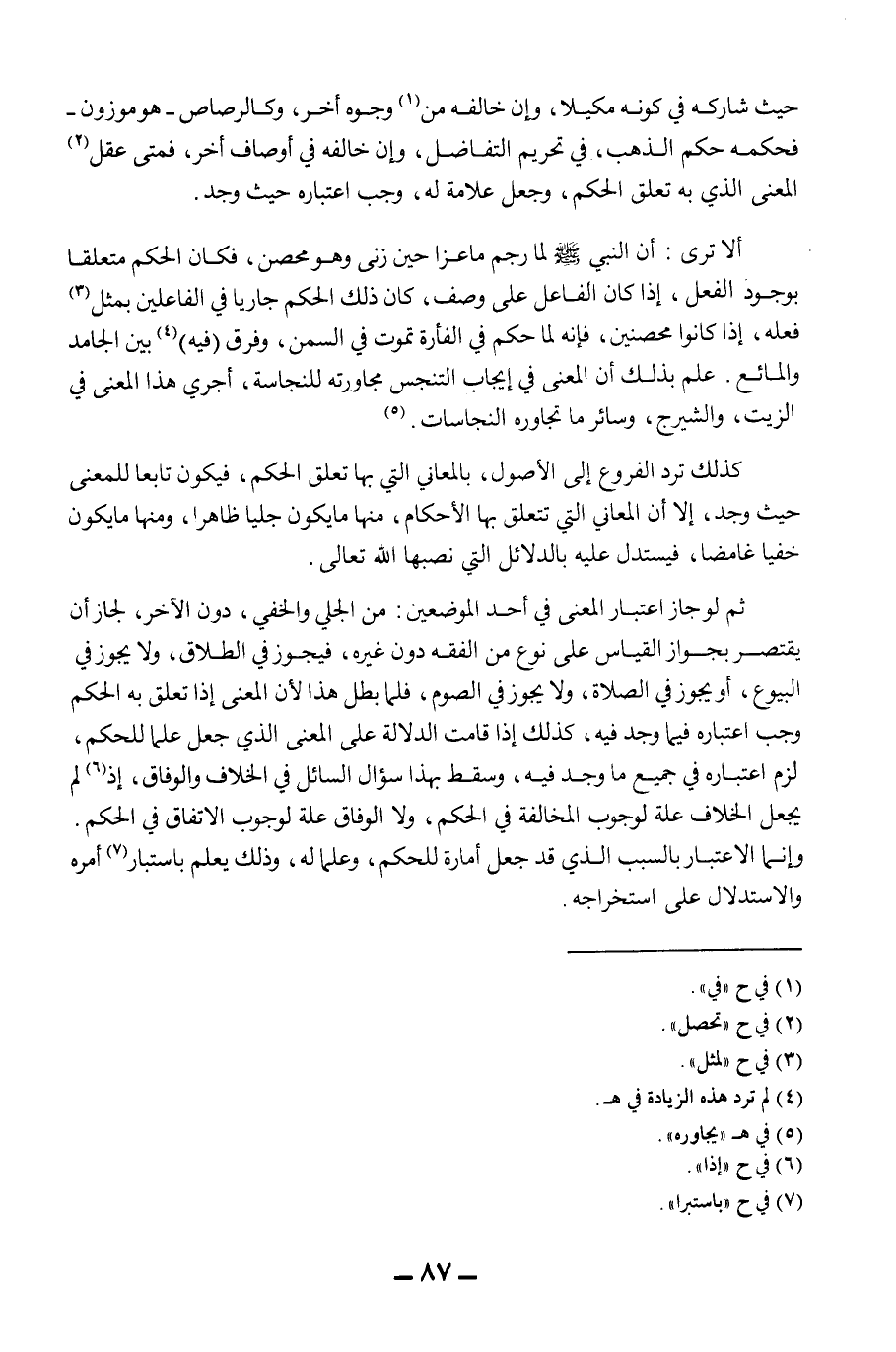 حَيْثُ شَارَكَهُ فِي كَوْنِهِ مَكِيلًا، وَإِنْ خَالَفَهُ مِنْ وُجُوهٍ أُخَرَ، وَكَالرَّصَاصِ - هُوَ مَوْزُونٌ - فَحُكْمُهُ حُكْمُ الذَّهَبِ، فِي تَحْرِيمِ التَّفَاضُلِ، وَإِنْ خَالَفَهُ فِي أَوْصَافٍ أُخَرَ، فَمَتَى عُقِلَ الْمَعْنَى الَّذِي بِهِ تَعَلَّقَ الْحُكْمُ، وَجُعِلَ عَلَامَةً لَهُ، وَجَبَ اعْتِبَارُهُ حَيْثُ وُجِدَ. أَلَا تَرَى: أَنَّ النَّبِيَّ - صَلَّى اللَّهُ عَلَيْهِ وَسَلَّمَ - لَمَّا رَجَمَ مَاعِزًا حِينَ زَنَى وَهُوَ مُحْصَنٌ، فَكَانَ الْحُكْمُ مُتَعَلِّقًا بِوُجُودِ الْفِعْلِ، إذَا كَانَ الْفَاعِلُ عَلَى وَصْفٍ، كَانَ ذَلِكَ الْحُكْمُ جَارِيًا فِي الْفَاعِلِينَ بِمِثْلِ فِعْلِهِ، إذَا كَانُوا مُحْصَنِينَ، فَإِنَّهُ لَمَّا حَكَمَ فِي الْفَأْرَةِ تَمُوتُ فِي السَّمْنِ، وَفَرَّقَ (فِيهِ) بَيْنَ الْجَامِدِ وَالْمَائِعِ. عُلِمَ بِذَلِكَ أَنَّ الْمَعْنَى فِي إيجَابِ التَّنَجُّسِ مُجَاوَرَتُهُ لِلنَّجَاسَةِ، أُجْرِيَ هَذَا الْمَعْنَى فِي الزَّيْتِ، وَالشَّيْرَجِ، وَسَائِرِ مَا تُجَاوِرُهُ النَّجَاسَاتُ. كَذَلِكَ تُرَدُّ الْفُرُوعُ إلَى الْأُصُولِ، بِالْمَعَانِي الَّتِي بِهَا تَعَلَّقَ الْحُكْمُ، فَيَكُونُ تَابِعًا لِلْمَعْنَى حَيْثُ وُجِدَ، إلَّا أَنَّ الْمَعَانِيَ الَّتِي تَتَعَلَّقُ بِهَا الْأَحْكَامُ، مِنْهَا مَا يَكُونُ جَلِيًّا ظَاهِرًا، وَمِنْهَا مَا يَكُونُ خَفِيًّا غَامِضًا، فَيُسْتَدَلُّ عَلَيْهِ بِالدَّلَائِلِ الَّتِي نَصَبَهَا اللَّهُ تَعَالَى. ثُمَّ لَوْ جَازَ اعْتِبَارُ الْمَعْنَى فِي أَحَدِ الْمَوْضِعَيْنِ: مِنْ الْجَلِيِّ وَالْخَفِيِّ، دُونَ الْآخَرِ، لَجَازَ أَنْ يَقْتَصِرَ بِجَوَازِ الْقِيَاسِ عَلَى نَوْعٍ مِنْ الْفِقْهِ دُونَ غَيْرِهِ، فَيَجُوزُ فِي الطَّلَاقِ، وَلَا يَجُوزُ فِي الْبُيُوعِ، أَوْ يَجُوزُ فِي الصَّلَاةِ، وَلَا يَجُوزُ فِي الصَّوْمِ، فَلَمَّا بَطَلَ هَذَا؛ لِأَنَّ الْمَعْنَى إذَا تَعَلَّقَ بِهِ الْحُكْمُ وَجَبَ اعْتِبَارُهُ فِيمَا وُجِدَ فِيهِ، كَذَلِكَ إذَا قَامَتْ الدَّلَالَةُ عَلَى الْمَعْنَى الَّذِي جُعِلَ عَلَمًا لِلْحُكْمِ، لَزِمَ اعْتِبَارُهُ فِي جَمِيعِ مَا وُجِدَ فِيهِ، وَسَقَطَ بِهَذَا سُؤَالُ السَّائِلِ فِي الْخِلَافِ وَالْوِفَاقِ،؛ إذْ لَمْ يُجْعَلْ الْخِلَافُ عِلَّةً لِوُجُوبِ الْمُخَالَفَةِ فِي الْحُكْمِ، وَلَا الْوِفَاقُ عِلَّةً لِوُجُوبِ الِاتِّفَاقِ فِي الْحُكْمِ.