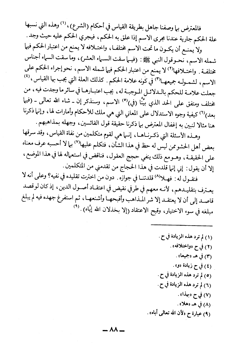 فَالْمُعْتَرِضُ بِمَا وَصَفْنَا جَاهِلٌ بِطَرِيقَةِ الْقِيَاسِ فِي أَحْكَامِ (الشَّرْعِ) ، وَهَذِهِ الَّتِي نَسَبَهَا عِلَّةُ الْحُكْمِ جَارِيَةٌ عِنْدَنَا مَجْرَى الِاسْمِ إذَا عُلِّقَ بِهِ الْحُكْمُ، فَيَجْرِي الْحُكْمُ عَلَيْهِ حَيْثُ وُجِدَ. وَلَا يَمْنَعُ أَنْ يَكُونَ مَا تَحْتَ الِاسْمِ مُخْتَلِفًا، وَاخْتِلَافُهُ لَا يَمْنَعُ مِنْ اعْتِبَارِ الْحُكْمِ فِيمَا شَمِلَهُ الِاسْمُ، نَحْوُ قَوْلِ النَّبِيِّ - صَلَّى اللَّهُ عَلَيْهِ وَسَلَّمَ -: «فِيمَا سَقَتْ السَّمَاءُ الْعُشْرُ» ، وَمَا سَقَتْ السَّمَاءُ أَجْنَاسٌ مُخْتَلِفَةٌ. وَاخْتِلَافُهَا لَا يَمْنَعُ مِنْ اعْتِبَارِ الْحُكْمِ فِيمَا شَمِلَهُ الِاسْمُ، نَحْوُ إجْرَاءِ الْحُكْمِ عَلَى الِاسْمِ، لِشُمُولِهِ جَمِيعَهَا فِي كَوْنِهِ عَلَامَةَ الْحُكْمِ. كَذَلِكَ الْعِلَّةُ الَّتِي يَجِبُ بِهَا الْقِيَاسُ، جُعِلَتْ عَلَامَةً لِلْحُكْمِ بِالدَّلَائِلِ الْمُوجِبَةِ لَهُ، يَجِبُ اعْتِبَارُهَا فِي سَائِرِ مَا وُجِدَتْ فِيهِ، مِنْ مُخْتَلِفٍ وَمُتَّفِقٍ عَلَى الْحَدِّ الَّذِي بَيَّنَّا (فِي) الِاسْمِ، وَسَنَذْكُرُ إنْ - شَاءَ اللَّهُ تَعَالَى - (فِيمَا بَعْدُ) كَيْفِيَّةَ وُجُوهِ الِاسْتِدْلَالِ عَلَى الْمَعَانِي الَّتِي هِيَ مِلْكٌ لِلْأَحْكَامِ وَأَمَارَاتٌ لَهَا، وَإِنَّمَا ذَكَرْنَا هُنَا مِثَالًا لِنُبَيِّنَ بِهِ إغْفَالَ الْمُعْتَرِضِ بِمَا ذَكَرْنَا حَقِيقَةَ قَوْلِ الْقَائِسِينَ، وَجَهْلَهُ بِمَذَاهِبِهِمْ. وَهَذِهِ الْأَسْئِلَةُ الَّتِي ذَكَرْنَاهَا، إنَّمَا هِيَ لِقَوْمٍ مُتَكَلِّمِينَ مِنْ نُفَاةِ الْقِيَاسِ، وَقَدْ سَرَقَهَا بَعْضُ أَهْلِ الْحَشْوِ مِمَّنْ لَيْسَ لَهُ حَظٌّ فِي هَذَا الشَّأْنِ، فَتَكَلَّمَ عَلَيْهَا بِمَا لَا أَحْسِبُهُ عَرَفَ مَعْنَاهُ عَلَى الْحَقِيقَةِ، وَهُوَ مَعَ ذَلِكَ يَنْفِي حُجَجَ الْعُقُولِ، فَنَاقَضَ فِي اسْتِعْمَالِهِ لَهَا فِي هَذَا الْمَوْضِعِ.