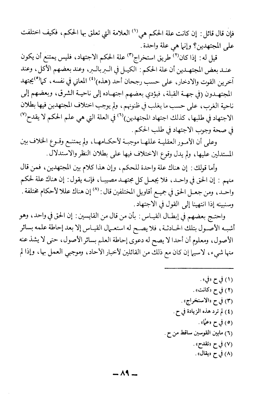 وَأَمَّا قَوْلُك: إنَّ هُنَاكَ عِلَّةٌ وَاحِدَةٌ لِلْحُكْمِ، وَإِنَّ هَذَا كَلَامٌ بَيْنَ الْمُجْتَهِدِينَ، فَمَنْ قَالَ مِنْهُمْ: إنَّ الْحَقَّ فِي وَاحِدٍ، فَلَا يُجْعَلُ كُلُّ مُجْتَهِدٍ مُصِيبًا، فَإِنَّهُ يَقُولُ: إنَّ هُنَاكَ عِلَّةً لِحُكْمٍ وَاحِدٍ، وَمَنْ جَعَلَ الْحَقَّ فِي جَمِيعِ أَقَاوِيلِ الْمُخْتَلِفِينَ قَالَ: إنَّ هُنَاكَ عِلَلًا لِأَحْكَامٍ مُخْتَلِفَةٍ. وَسَنُبَيِّنُهُ إذَا انْتَهَيْنَا إلَى الْقَوْلِ فِي الِاجْتِهَادِ. وَاحْتَجَّ بَعْضُهُمْ فِي إبْطَالِ الْقِيَاسِ: بِأَنَّ مَنْ قَالَ مِنْ الْقَائِسِينَ: إنَّ الْحَقَّ فِي وَاحِدٍ، وَهُوَ أَشْبَهُ الْأُصُولِ بِتِلْكَ الْحَادِثَةِ، فَلَا يَصِحُّ لَهُ اسْتِعْمَالُ الْقِيَاسِ إلَّا بَعْدَ إحَاطَةِ عِلْمِهِ بِسَائِرِ الْأُصُولِ، وَمَعْلُومٌ أَنَّ أَحَدًا لَا يَصِحُّ لَهُ دَعْوَى إحَاطَةِ الْعِلْمِ بِسَائِرِ الْأُصُولِ، حَتَّى لَا يَشِذَّ عَنْهُ مِنْهَا شَيْءٌ، لَا سِيَّمَا إنْ كَانَ مَعَ ذَلِكَ مِنْ الْقَائِلِينَ لِأَخْبَارِ الْآحَادِ، وَمُوجِبِي الْعَمَلِ بِهَا، وَإِذَا لَمْ