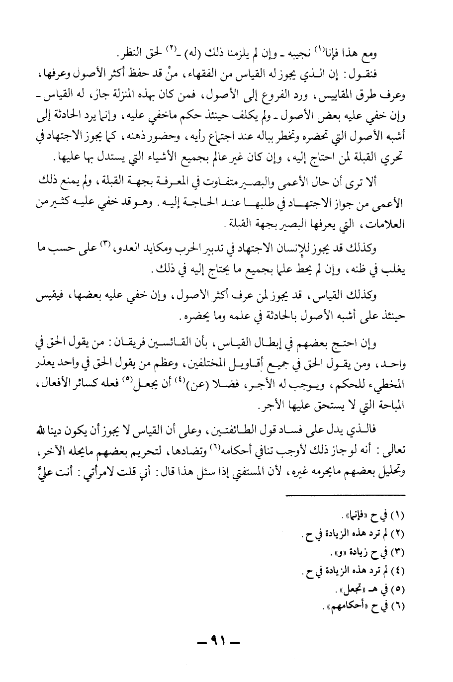 أَلَا تَرَى أَنَّ حَالَ الْأَعْمَى وَالْبَصِيرِ مُتَفَاوِتٌ فِي الْمَعْرِفَةِ بِجِهَةِ الْقِبْلَةِ، وَلَمْ يَمْنَعْ ذَلِكَ الْأَعْمَى مِنْ جَوَازِ الِاجْتِهَادِ فِي طَلَبِهَا عِنْدَ الْحَاجَةِ إلَيْهِ. وَهُوَ قَدْ خَفِيَ عَلَيْهِ كَثِيرٌ مِنْ الْعَلَامَاتِ، الَّتِي يَعْرِفُهَا الْبَصِيرُ بِجِهَةِ الْقِبْلَةِ. وَكَذَلِكَ قَدْ يَجُوزُ لِلْإِنْسَانِ الِاجْتِهَادُ فِي تَدْبِيرِ الْحَرْبِ وَمَكَايِدِ الْعَدُوِّ، عَلَى حَسَبِ مَا يَغْلِبُ فِي ظَنِّهِ، وَإِنْ لَمْ يُحِطْ عِلْمًا بِجَمِيعِ مَا يَحْتَاجُ إلَيْهِ فِي ذَلِكَ. وَكَذَلِكَ الْقِيَاسُ، قَدْ يَجُوزُ لِمَنْ عَرَفَ أَكْثَرَ الْأُصُولِ، وَإِنْ خَفِيَ عَلَيْهِ بَعْضُهَا، فَيَقِيسُ حِينَئِذٍ عَلَى أَشْبَهِ الْأُصُولِ بِالْحَادِثَةِ فِي عِلْمِهِ وَمَا يَحْضُرُهُ. وَإِنْ احْتَجَّ بَعْضُهُمْ فِي إبْطَالِ الْقِيَاسِ، بِأَنَّ الْقَائِسِينَ فَرِيقَانِ: مَنْ يَقُولُ الْحَقُّ فِي وَاحِدٍ، وَمَنْ يَقُولُ الْحَقُّ فِي جَمِيعِ أَقَاوِيلِ الْمُخْتَلِفِينَ، وَعَظُمَ مَنْ يَقُولُ الْحَقُّ فِي وَاحِدٍ؛ يَعْذُرُ الْمُخْطِئَ لِلْحُكْمِ، وَيُوجِبُ لَهُ الْأَجْرَ، فَضْلًا (عَنْ) أَنْ يَجْعَلَ فِعْلَهُ كَسَائِرِ الْأَفْعَالِ، الْمُبَاحَةِ الَّتِي لَا يَسْتَحِقُّ عَلَيْهَا الْأَجْرَ. فَاَلَّذِي يَدُلُّ عَلَى فَسَادِ قَوْلِ الطَّائِفَتَيْنِ، وَعَلَى أَنَّ الْقِيَاسَ لَا يَجُوزُ أَنْ يَكُونَ دِينًا لِلَّهِ تَعَالَى: أَنَّهُ لَوْ جَازَ ذَلِكَ لَأَوْجَبَ تَنَافِيَ أَحْكَامِهِ وَتَضَادَّهَا، لِتَحْرِيمِ بَعْضِهِمْ مَا يُحِلُّهُ الْآخَرُ، وَتَحْلِيلِ بَعْضِهِمْ مَا يُحَرِّمُهُ غَيْرُهُ؛ لِأَنَّ الْمُسْتَفْتِيَ إذَا سَأَلَ هَذَا قَالَ: إنِّي قُلْتُ لِامْرَأَتِي: أَنْتِ عَلَيَّ.