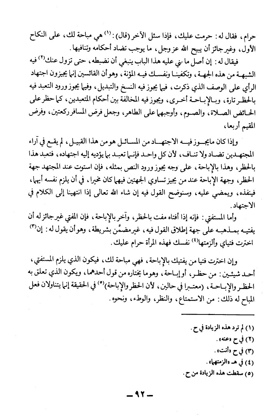 حَرَامٌ، فَقَالَ لَهُ: حُرِّمَتْ عَلَيْك، فَإِذَا سَأَلَ الْآخَرَ (قَالَ) : هِيَ مُبَاحَةٌ لَك، عَلَى النِّكَاحِ الْأَوَّلِ، وَغَيْرُ جَائِزٍ أَنْ يُبِيحَ اللَّهُ عَزَّ وَجَلَّ، مَا يُوجِبُ تَضَادَّ أَحْكَامِهِ وَتَنَافِيهَا. فَيُقَالُ لَهُ: إنَّ أَصْلَ مَا بُنِيَ عَلَيْهِ هَذَا الْبَابُ يَنْبَغِي أَنْ نَضْبِطَهُ، حَتَّى تَزُولَ عَنْك فِيهِ الشُّبْهَةُ مِنْ هَذِهِ الْجِهَةِ، وَتَكْفِينَا وَنَفْسَك فِيهِ الْمُؤْنَةُ، وَهُوَ أَنَّ الْقَائِسِينَ إنَّمَا يُجِيزُونَ اجْتِهَادَ الرَّأْيِ عَلَى الْوَصْفِ الَّذِي ذَكَرْت، فِيمَا يَجُوزُ فِيهِ النَّسْخُ وَالتَّبْدِيلُ، وَفِيمَا يَجُوزُ وُرُودُ التَّعَبُّدِ فِيهِ بِالْحَظْرِ تَارَةً، وَبِالْإِبَاحَةِ أُخْرَى، وَيَجُوزُ فِيهِ الْمُخَالَفَةُ بَيْنَ أَحْكَامِ الْمُتَعَبِّدِينَ، كَمَا حَظَرَ عَلَى الْحَائِضِ الصَّلَاةَ، وَالصَّوْمَ، وَأَوْجَبَهُمَا عَلَى الطَّاهِرِ، وَجَعَلَ فَرْضَ الْمُسَافِرِ رَكْعَتَيْنِ، وَفَرْضَ الْمُقِيمِ أَرْبَعًا، وَإِذَا كَانَ مَا يَجُوزُ فِيهِ الِاجْتِهَادُ مِنْ الْمَسَائِلِ هُوَ مِنْ هَذَا الْقَبِيلِ، لَمْ يَقَعْ فِي آرَاءِ الْمُجْتَهِدِينَ تَضَادٌّ وَلَا تَنَافٍ،؛ لِأَنَّ كُلَّ وَاحِدٍ فَإِنَّمَا تَعَبَّدَ بِمَا يُؤَدِّيهِ إلَيْهِ اجْتِهَادُهُ، فَتَعَبَّدَ هَذَا بِالْحَظْرِ، وَهَذَا بِالْإِبَاحَةِ، عَلَى وَجْهٍ يَجُوزُ وُرُودُ النَّصِّ بِمِثْلِهِ، فَإِنْ اسْتَوَتْ عِنْدَ الْمُجْتَهِدِ جِهَةُ الْحَظْرِ، وَجِهَةُ الْإِبَاحَةِ عِنْدَ مَنْ يُجِيزُ تُسَاوِي الْجِهَتَيْنِ فِيهِمَا كَانَ مُخْبِرًا، فِي أَنْ يُلْزِمَ نَفْسَهُ أَيَّهُمَا، فَيُنْفِذَهُ، وَيَمْضِيَ عَلَيْهِ، وَسَنُوَضِّحُ الْقَوْلَ فِيهِ إنْ شَاءَ اللَّهُ تَعَالَى إذَا انْتَهَيْنَا إلَى الْكَلَامِ فِي الِاجْتِهَادِ. وَأَمَّا الْمُسْتَفْتِي: فَإِنَّهُ إذَا أَفْتَاهُ مُفْتٍ بِالْحَظْرِ، وَآخَرُ بِالْإِبَاحَةِ، فَإِنَّ الْمُفْتِيَ غَيْرُ جَائِزٍ لَهُ أَنْ يُفْتِيَهُ بِمَذْهَبِهِ عَلَى جِهَةِ إطْلَاقِ الْقَوْلِ فِيهِ، غَيْرَ مُضَمَّنٍ بِشَرِيطَةٍ، وَهُوَ أَنْ يَقُولَ لَهُ: إنْ اخْتَرْت فُتْيَايَ وَأَلْزَمْتَهَا نَفْسَك فَهَذِهِ الْمَرْأَةُ حَرَامٌ عَلَيْك.