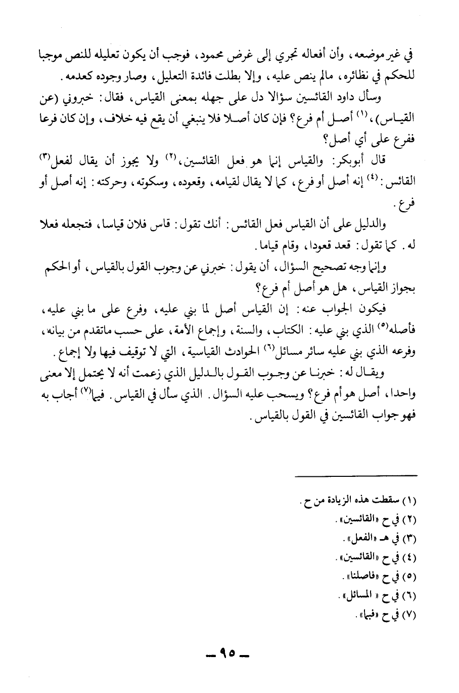 وَسَأَلَ دَاوُد الْقَائِسِينَ سُؤَالًا دَلَّ عَلَى جَهْلِهِ بِمَعْنَى الْقِيَاسِ، فَقَالَ: خَبِّرُونِي (عَنْ الْقِيَاسِ) ، أَصْلٌ أَمْ فَرْعٌ؟ فَإِنْ كَانَ أَصْلًا فَلَا يَنْبَغِي أَنْ يَقَعَ فِيهِ خِلَافٌ، وَإِنْ كَانَ فَرْعًا فَفَرْعٌ عَلَى أَيِّ أَصْلٍ؟ قَالَ أَبُو بَكْرٍ: وَالْقِيَاسُ إنَّمَا هُوَ فِعْلُ الْقَائِسِينَ، وَلَا يَجُوزُ أَنْ يُقَالَ لِفِعْلِ الْقَائِسِ: إنَّهُ أَصْلٌ، أَوْ فَرْعٌ، كَمَا لَا يُقَالُ لِقِيَامِهِ، وَقُعُودِهِ، وَسُكُوتِهِ، وَحَرَكَتِهِ: إنَّهُ أَصْلٌ، أَوْ فَرْعٌ. وَالدَّلِيلُ عَلَى أَنَّ الْقِيَاسَ فِعْلُ الْقَائِسِ: أَنَّك تَقُولُ: قَاسَ فُلَانٌ قِيَاسًا، فَتَجْعَلُهُ فِعْلًا لَهُ. كَمَا تَقُولُ: قَعَدَ قُعُودًا، وَقَامَ قِيَامًا. وَإِنَّمَا وَجْهُ تَصْحِيحِ السُّؤَالِ، أَنْ يَقُولَ: خَبِّرْنِي عَنْ وُجُوبِ الْقَوْلِ بِالْقِيَاسِ، أَوْ الْحُكْمِ بِجَوَازِ الْقِيَاسِ، هَلْ هُوَ أَصْلٌ أَمْ فَرْعٌ؟ فَيَكُونُ الْجَوَابُ عَنْهُ: إنَّ الْقِيَاسَ أَصْلٌ لِمَا بُنِيَ عَلَيْهِ، وَفَرْعٌ عَلَى مَا بُنِيَ عَلَيْهِ، فَأَصْلُهُ الَّذِي بُنِيَ عَلَيْهِ: الْكِتَابُ، وَالسُّنَّةُ، وَإِجْمَاعُ الْأُمَّةِ، عَلَى حَسَبِ مَا تَقَدَّمَ مِنْ بَيَانِهِ، وَفَرْعُهُ الَّذِي بُنِيَ عَلَيْهِ سَائِرُ مَسَائِلِ الْحَوَادِثِ الْقِيَاسِيَّةِ، الَّتِي لَا تَوْقِيفَ فِيهَا وَلَا إجْمَاعَ. وَيُقَالُ لَهُ: خَبِّرْنَا عَنْ وُجُوبِ الْقَوْلِ بِالدَّلِيلِ الَّذِي زَعَمْتَ أَنَّهُ لَا يَحْتَمِلُ إلَّا مَعْنًى وَاحِدًا، أَصْلٌ هُوَ أَمْ فَرْعٌ؟ وَيُسْحَبُ عَلَيْهِ السُّؤَالُ. الَّذِي سَأَلَ فِي الْقِيَاسِ. فِيمَا أَجَابَ بِهِ فَهُوَ جَوَابُ الْقَائِسِينَ فِي الْقَوْلِ بِالْقِيَاسِ.