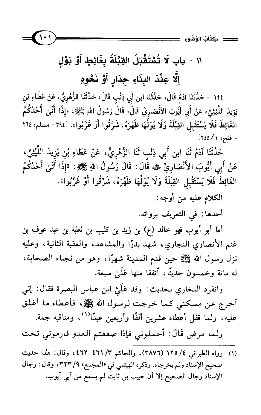 144 - حَدَّثَنَا آدَمُ قَالَ: حَدَّثَنَا ابن أَبي ذِئبٍ قَالَ: حَدَّثَنَا الزُّهْرِيُّ، عَنْ عَطَاءِ بْنِ يَزِيدَ اللَّيْثِيِّ، عَنْ أبي أَيُّوبَ الأَنْصَارِيِّ قَالَ: قَالَ رَسُولُ اللهِ - صلى الله عليه وسلم -: "إِذَا أَتَى أَحَدُكُمُ الغَائِطَ فَلَا يَسْتَقْبِلِ القِبْلَةَ وَلَا يُوَلِّهَا ظَهْرَهُ، شَرِّقُوا أَوْ غَرِّبُوا". [394 - مسلم: 264 - فتح: 1/ 245]