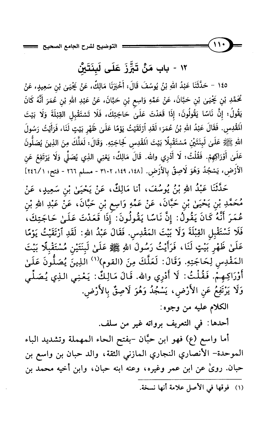 145 - حَدَّثَنَا عَبْدُ اللهِ بْنُ يُوسُفَ قَالَ: أَخْبَرَنَا مَالِكٌ، عَنْ يحيى بْنِ سَعِيدٍ، عَنْ مُحَمَّدِ بْنِ يحيى بْنِ حَبَّانَ، عَنْ عَمِّهِ وَاسِعِ بْنِ حَبَّانَ، عَنْ عَبدِ اللهِ بْنِ غمَرَ أَنَّهُ كَانَ يَقُولُ: إِنَّ نَاسًا يَقُولُونَ: إِذَا قَعَدْتَ عَلَى حَاجَتِكَ، فَلَا تَسْتَقْبِلِ القِبْلَةَ وَلَا بَيْتَ الَمقْدِسِ. فَقَالَ عَبْدُ اللهِ بْنُ عُمَرَ: لَقَدِ ارْتَقَيتُ يَوْمًا عَلَى ظَهْرِ بَيْتٍ لَنَا، فَرَأَيْتُ رَسُولَ اللهِ - صلى الله عليه وسلم - عَلَى لَبِنَتَيْنِ مُسْتَقْبِلًا بَيْتَ الَمقْدِسِ لَحِاجَتِهِ. وَقَالَ: لَعَلَّكَ مِنَ الذِينَ يُصَلُّونَ عَلَى أَوْرَاكِهِمْ. فَقُلْتُ: لَا أَدْرِي والله. قَالَ مَالِكٌ: يَعْنِي الذِي يُصَلِّي وَلَا يَرْتَفِعُ عَنِ الأَرْضِ، يَسْجدُ وَهُوَ لَاصِقٌ بِالأَرْضِ. [148، 149، 3102 - مسلم 266 - فتح: 246/ 1]