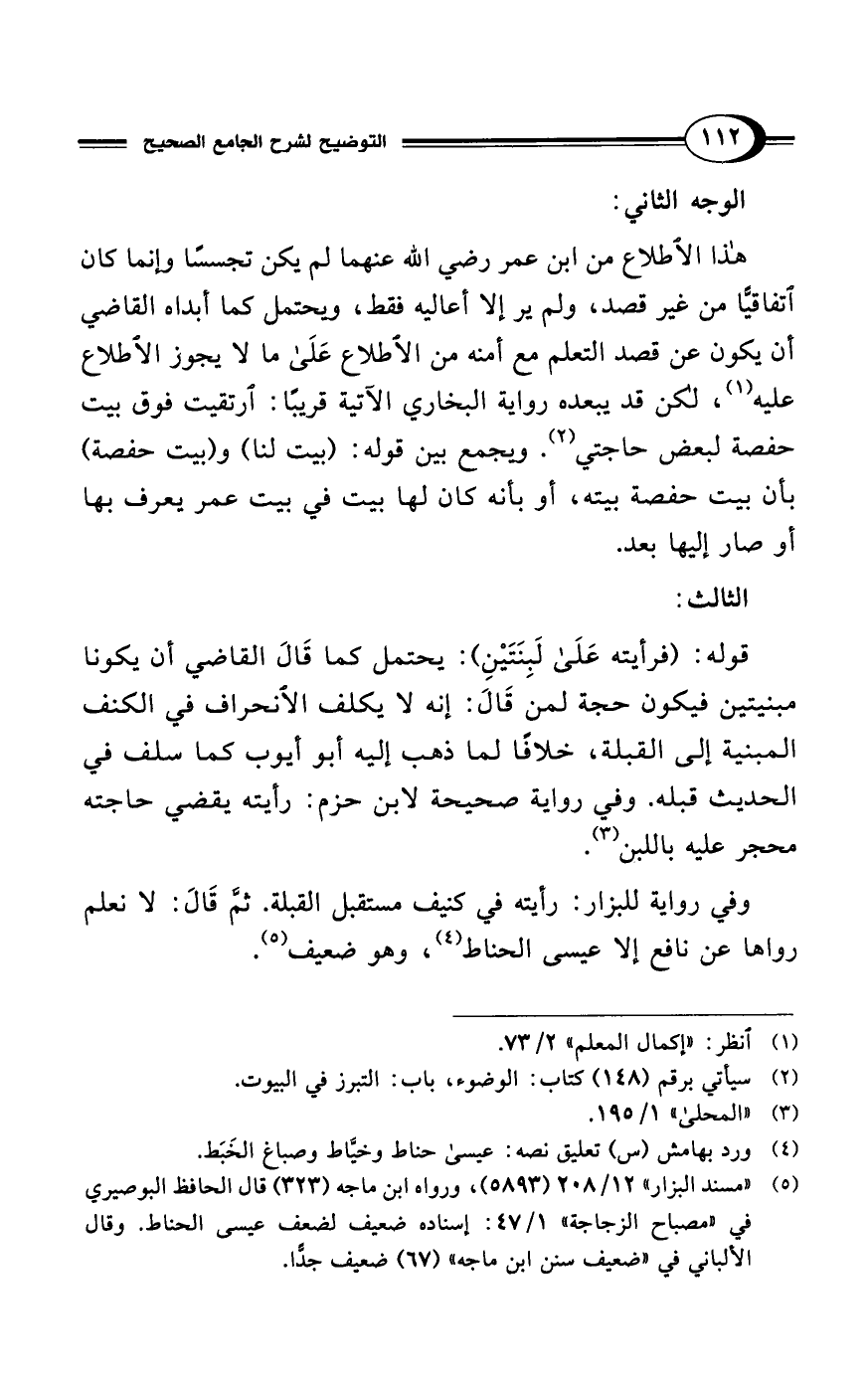 وفي رواية للبزار: رأيته في كنيف مستقبل القبلة. ثم قَالَ: لا نعلم رواها عن نافع إلا عيسى الحناط (¬4)، وهو ضعيف (¬5).
