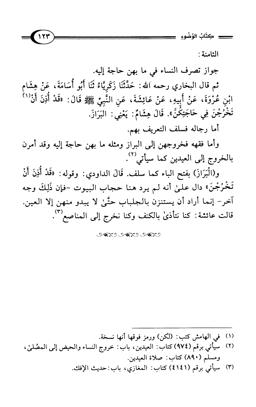 ثم قال البخاري رحمه- الله: حَدَّثنَا زَكَرِيَّاءُ ثنَا أَبُو أُسَامَةَ، عَنْ هِشَام ابْنِ عُرْوَةَ، عَنْ أَبِيهِ، عَنْ عَائِشَةَ، عَنِ النَّبيِّ - صلى الله عليه وسلم - قَالَ: "قَدْ أُذِنَ أَنْ (¬1) تَخْرُجْنَ فِي حَاجَتِكُنَّ". قَالَ هِشَامٌ: يَعْنِي: البَرَازَ.