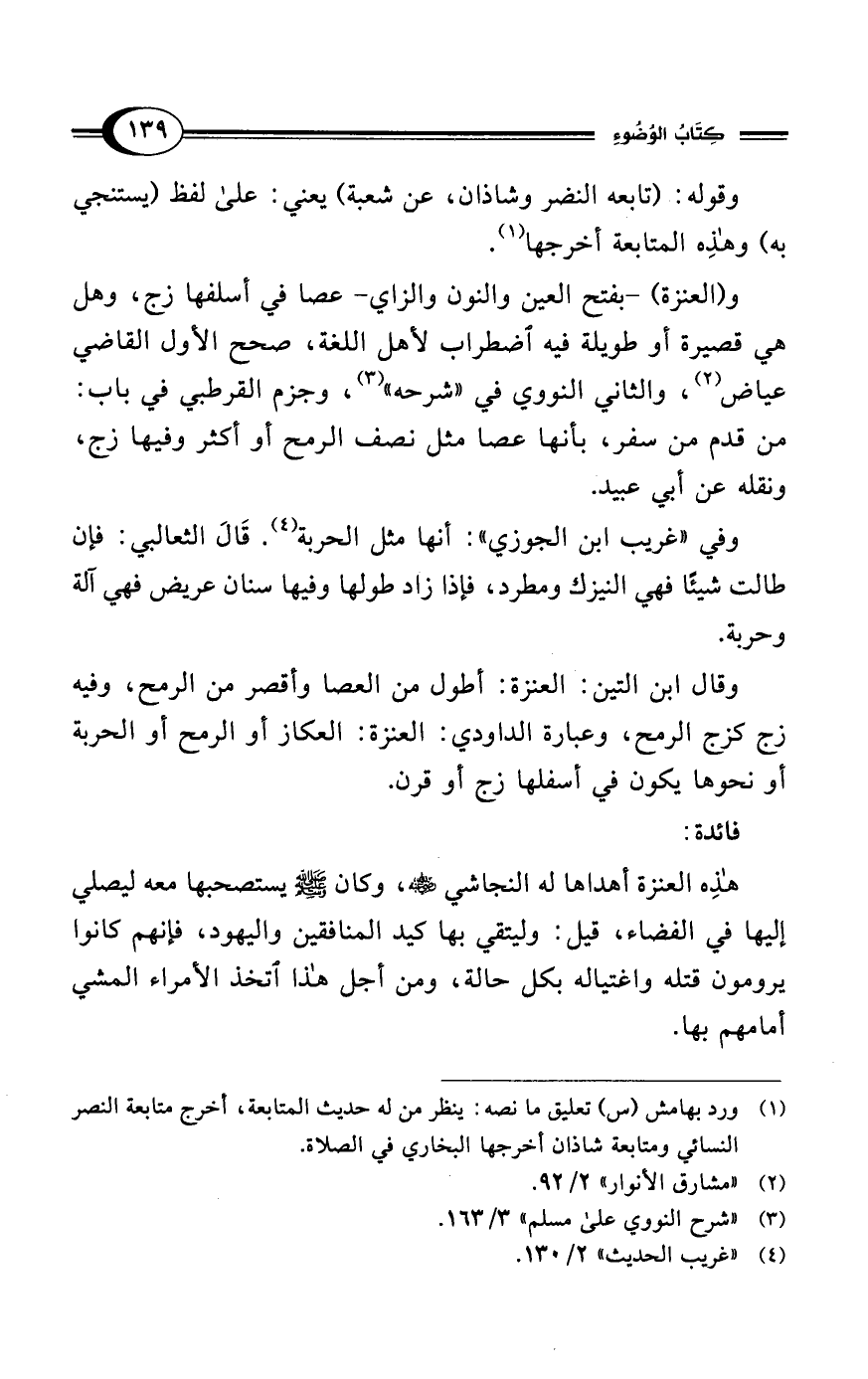 و (العنزة) -بفتح العين والنون والزاي- عصا في أسلفها زج، وهل هي قصيرة أو طويلة فيه اضطراب لأهل اللغة، صحح الأول القاضي عياض (¬2)، والثاني النووي في "شرحه" (¬3)، وجزم القرطبي في باب: من قدم من سفر، بأنها عصا مثل نصف الرمح أو أكثر وفيها زج، ونقله عن أبي عبيد.