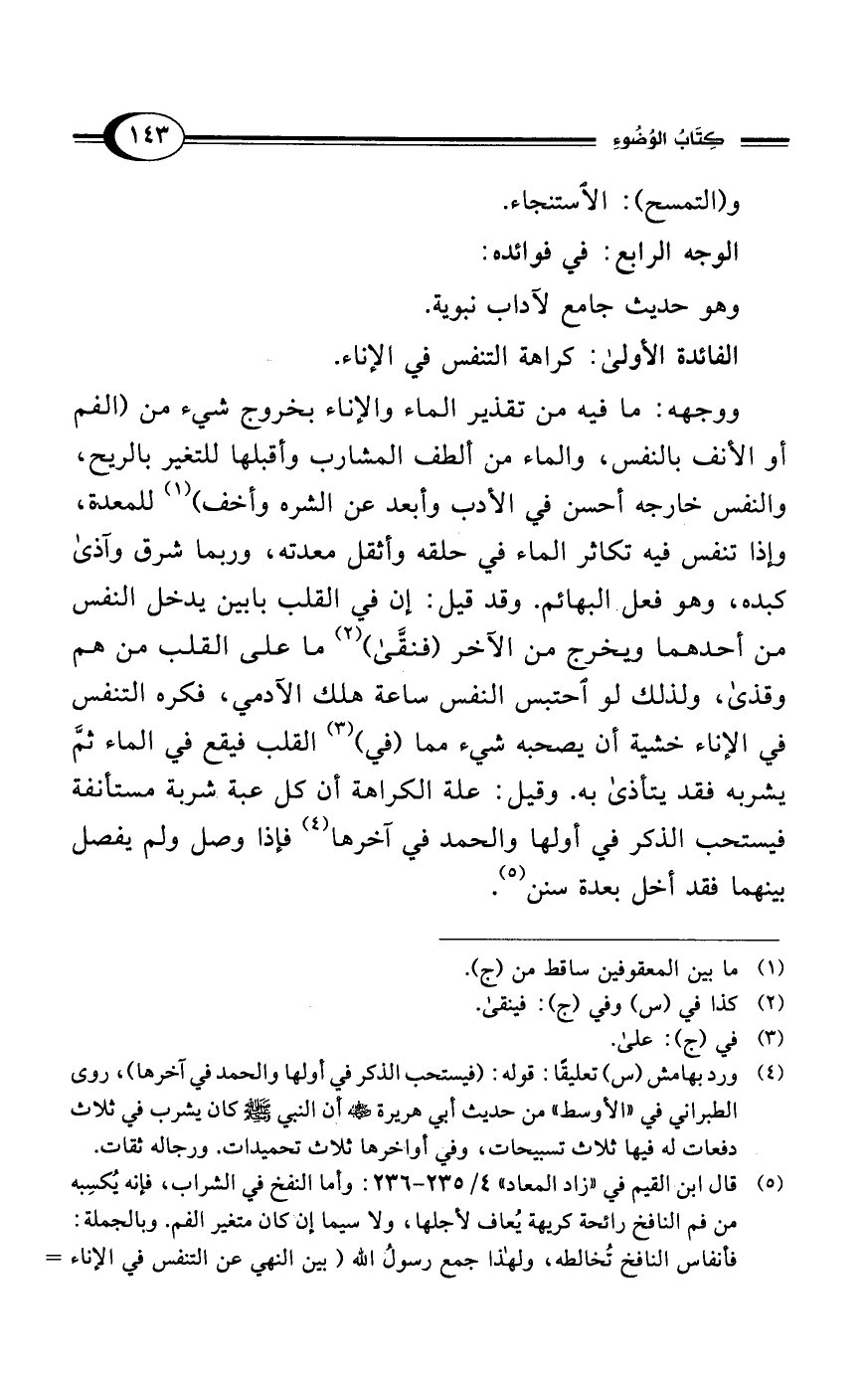 الفائدة الأولى: كراهة التنفس في الإناء.